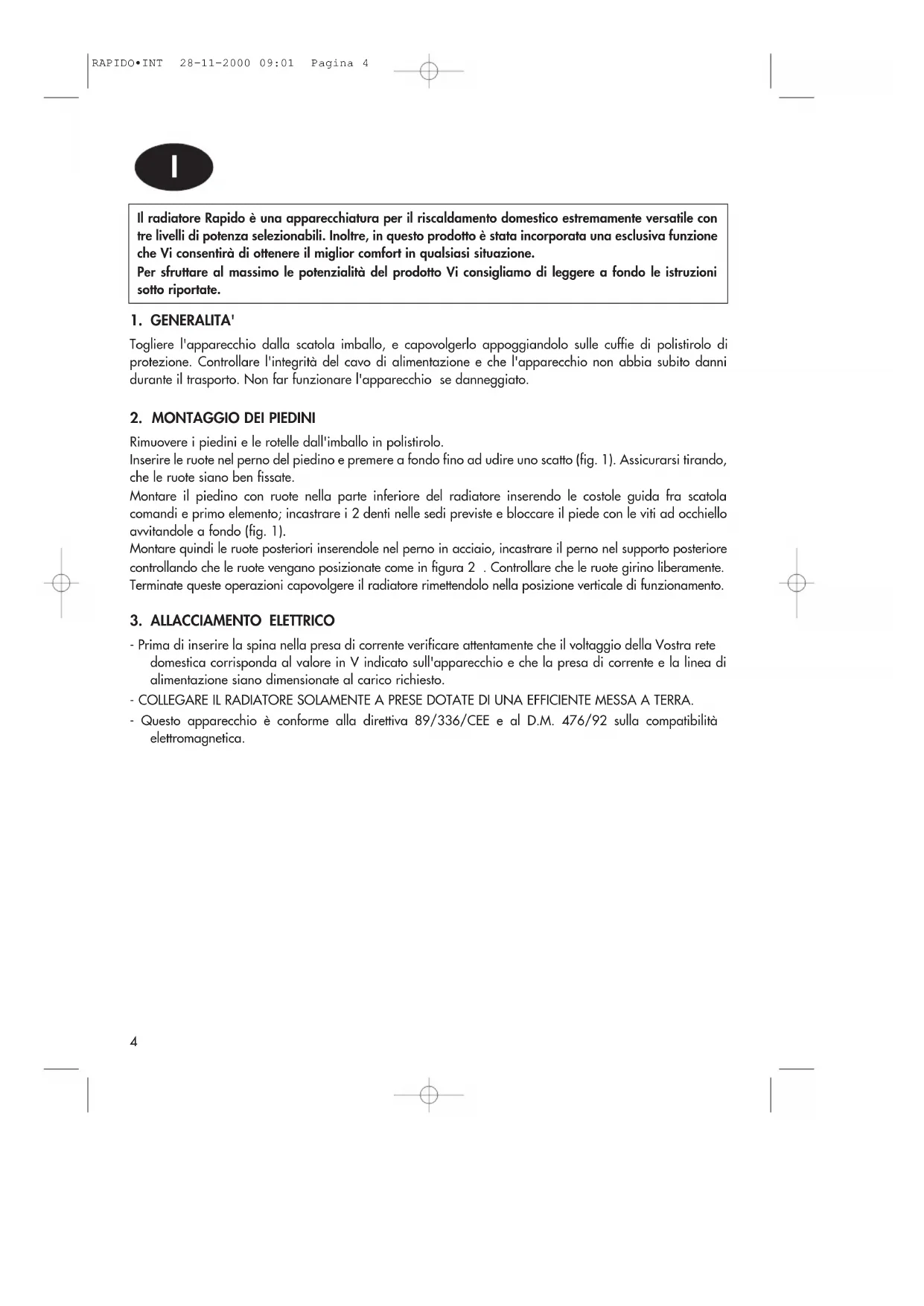 IHS RAPIDO•INT 28-11-2000 09:01 Pagina 3Il radiatore Rapido è una apparecchiatura per il riscaldamento domestico estremamente versatile con tre livelli di potenza selezionabili. Inoltre, in questo prodotto è stata incorporata una esclusiva funzione che Vi consentirà di ottenere il miglior comfort in qualsiasi situazione. Per sfruttare al massimo le potenzialità del prodotto Vi consigliamo di leggere a fondo le istruzioni sotto riportate.