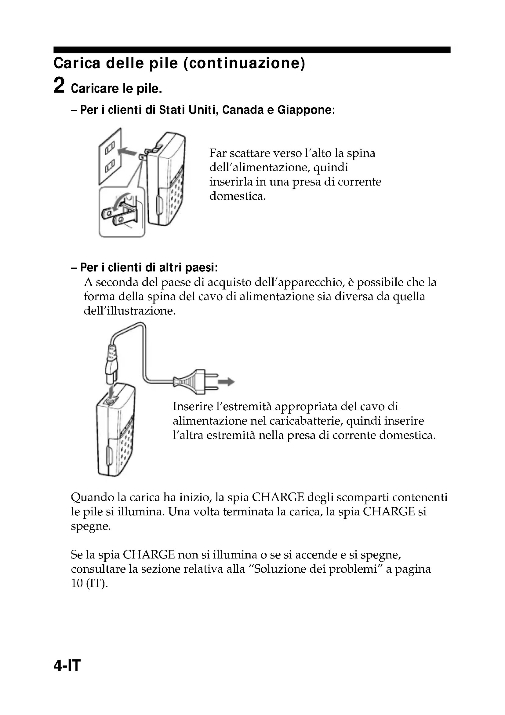 - Nel presente documento, viene utilizzato il termine pile in riferimento alle pile ricaricabili. Identificazione delle parti.................................................................................... 3 Carica delle pile .................................................................................................... 3 Precauzioni ............................................................................................................ 6 Con pile all’idruro di nichel metallico ............................................................... 8 Soluzione dei problemi ...................................................................................... 10 Caratteristiche ..................................................................................................... 114-IT 2 Caricare le pile. – Per i clienti di Stati Uniti, Canada e Giappone: – Per i clienti di altri paesi: A seconda del paese di acquisto dell’apparecchio, è possibile che la forma della spina del cavo di alimentazione sia diversa da quella dell’illustrazione. Quando la carica ha inizio, la spia CHARGE degli scomparti contenenti le pile si illumina. Una volta terminata la carica, la spia CHARGE si spegne. Se la spia CHARGE non si illumina o se si accende e si spegne, consultare la sezione relativa alla “Soluzione dei problemi” a pagina 10 (IT). Far scattare verso l’alto la spina dell’alimentazione, quindi inserirla in una presa di corrente domestica. Inserire l’estremità appropriata del cavo di alimentazione nel caricabatterie, quindi inserire l’altra estremità nella presa di corrente domestica. Carica delle pile (continuazione)5-IT 3 Una volta che le pile sono completamente cariche, scollegare la spina di alimentazione, aprire il coperchio, quindi rimuovere le pile. – Per i clienti di Stati Uniti, Canada e Giappone: Quando il processo di carica è completato, chiudere la spina dell’alimentazione e riporla all’interno dell’apparecchio. – Per i clienti di altri paesi: Quando la spina dell’alimentazione viene scollegata, accertarsi di tirare afferrando la spina e non il cavo. Carica rapida Con il presente caricabatterie, è possibile caricare rapidamente una o due pile al nichel-idruro di metallo Sony HR11/45, HR03 (formato AAA), NH- AAA o Sony HR15/51, HR6 (formato AA), NH-AA. Tempi di carica Carica ultrarapida Carica rapida normale (una o due pile) (tre o quattro pile) Pile Sony HR11/45, HR03 (formato AAA), circa 1 h 15 min circa 2 h 30 min NH-AAA Pile Sony HR15/51, HR6 (formato AA), circa 1 h 55 min circa 3 h 50 min NH-AA I tempi di carica riportati si riferiscono a pile dotate della capacità indicata di seguito.Pile Sony HR11/45, HR03 (formato AAA), NH-AAA: 750 mAh (standard)Pile Sony HR15/51, HR6 (formato AA), NH-AA: 1 750 mAh (standard) Non collegare il caricabatterie ad un adattatore di tensione (convertitore da viaggio) in caso di viaggi all’estero, poiché ciò potrebbe causare surriscaldamento o problemi di funzionamento.6-IT Precauzioni