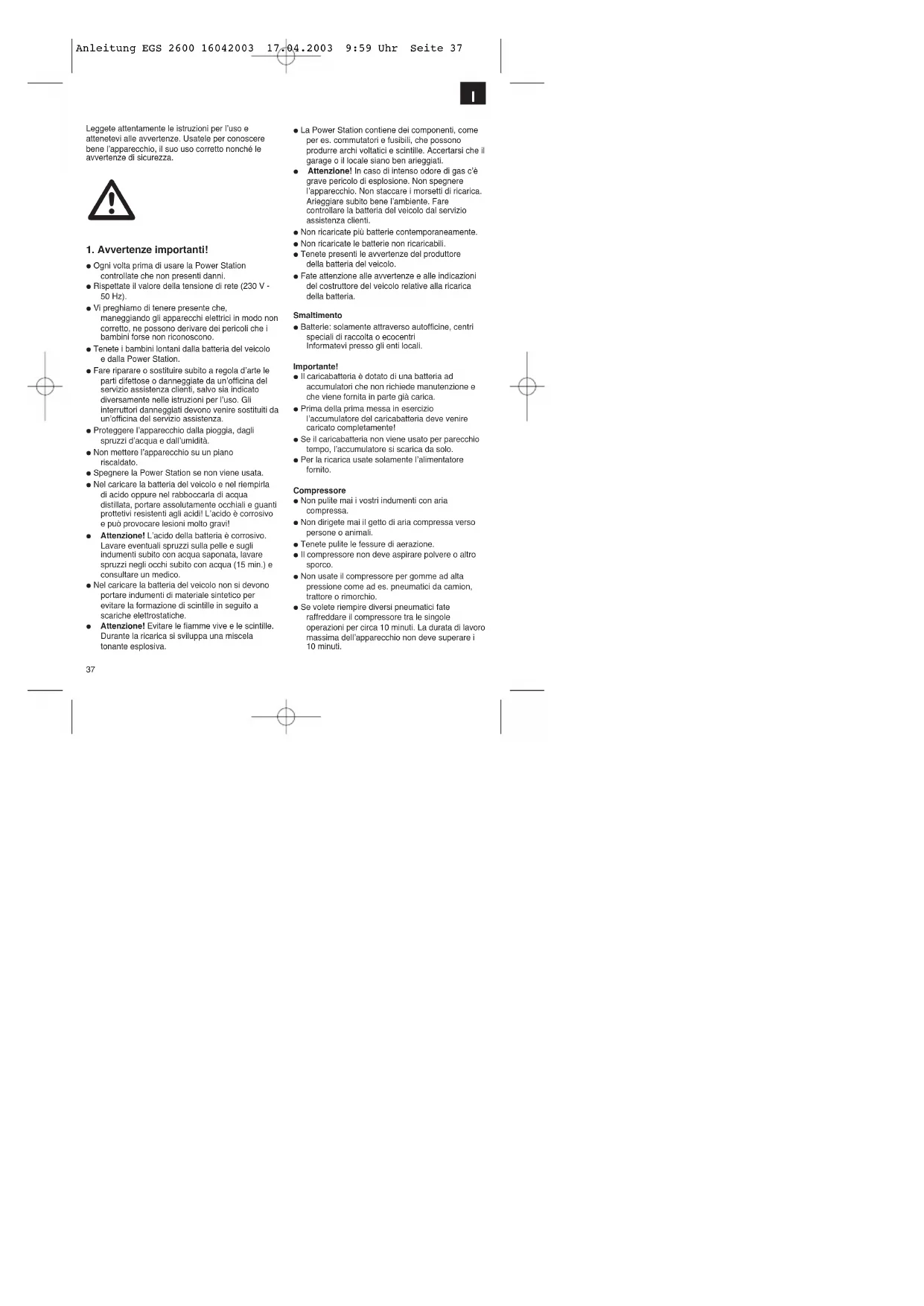 Ogni volta prima di usare la Power Station controllate che non presenti danni. Rispettate il valore della tensione di rete (230 V - 50 Hz). Vi preghiamo di tenere presente che, maneggiando gli apparecchi elettrici in modo noncorretto, ne possono derivare dei pericoli che ibambini forse non riconoscono. Tenete i bambini lontani dalla batteria del veicolo e dalla Power Station. Fare riparare o sostituire subito a regola d’arte le parti difettose o danneggiate da un’officina delservizio assistenza clienti, salvo sia indicatodiversamente nelle istruzioni per l’uso. Gliinterruttori danneggiati devono venire sostituiti daun’officina del servizio assistenza. Proteggere l’apparecchio dalla pioggia, dagli spruzzi d’acqua e dall’umidità. Non mettere l’apparecchio su un piano riscaldato. Spegnere la Power Station se non viene usata. Nel caricare la batteria del veicolo e nel riempirla di acido oppure nel rabboccarla di acquadistillata, portare assolutamente occhiali e guantiprottetivi resistenti agli acidi! L’acido è corrosivoe può provocare lesioni molto gravi! Attenzione! L’acido della batteria è corrosivo. Lavare eventuali spruzzi sulla pelle e sugliindumenti subito con acqua saponata, lavarespruzzi negli occhi subito con acqua (15 min.) econsultare un medico. Nel caricare la batteria del veicolo non si devono portare indumenti di materiale sintetico perevitare la formazione di scintille in seguito ascariche elettrostatiche. Attenzione! Evitare le fiamme vive e le scintille. Durante la ricarica si sviluppa una miscelatonante esplosiva. La Power Station contiene dei componenti, come per es. commutatori e fusibili, che possonoprodurre archi voltatici e scintille. Accertarsi che ilgarage o il locale siano ben arieggiati. Attenzione! In caso di intenso odore di gas c’è grave pericolo di esplosione. Non spegnerel’apparecchio. Non staccare i morsetti di ricarica.Arieggiare subito bene l’ambiente. Farecontrollare la batteria del veicolo dal servizioassistenza clienti. Non ricaricate più batterie contemporaneamente. Non ricaricate le batterie non ricaricabili. Tenete presenti le avvertenze del produttore della batteria del veicolo. Fate attenzione alle avvertenze e alle indicazioni del costruttore del veicolo relative alla ricaricadella batteria.Smaltimento Batterie: solamente attraverso autofficine, centri speciali di raccolta o ecocentriInformatevi presso gli enti locali.Importante! Il caricabatteria è dotato di una batteria ad accumulatori che non richiede manutenzione eche viene fornita in parte già carica. Prima della prima messa in esercizio l’accumulatore del caricabatteria deve venirecaricato completamente! Se il caricabatteria non viene usato per parecchio tempo, l’accumulatore si scarica da solo. Per la ricarica usate solamente l’alimentatore fornito.Compressore Non pulite mai i vostri indumenti con aria compressa. Non dirigete mai il getto di aria compressa verso persone o animali. Tenete pulite le fessure di aerazione. Il compressore non deve aspirare polvere o altro sporco. Non usate il compressore per gomme ad alta pressione come ad es. pneumatici da camion,trattore o rimorchio. Se volete riempire diversi pneumatici fate raffreddare il compressore tra le singoleoperazioni per circa 10 minuti. La durata di lavoromassima dell’apparecchio non deve superare i10 minuti. Anleitung EGS 2600 16042003 17.04.2003 9:59 Uhr Seite 372. Elementi forniti 1 Carica batteria con compressore 1 alimentatore di ricarica 1 cavo di collegamento con spina tipo accendisigari 1 Set di adattatore valvole