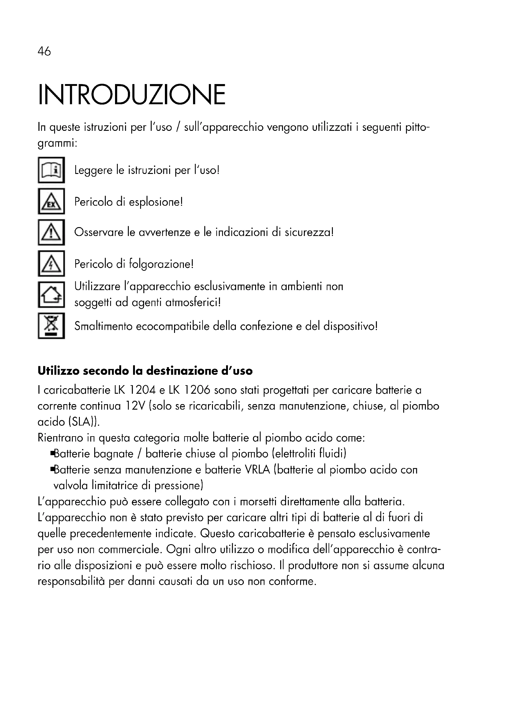 1 istruzioni Dati tecnici Modello LK 1204 LK 1206 Numero articolo 97000 97001 Corrente max. di carica 4 A (effettivi) 6 A (effettivi) Tensione batteria 12 V 12 V Capacità della batteria 2 Ah – 40 Ah 2 Ah – 60 Ah Indicatore di carica LED LED Tensione in ingresso 230 V / 50 Hz 230 V / 50 Hz48 SICUREZZA Indicationi di sicurezza generali Leggere tutte le indicazioni e le istruzioni di sicurezza. Omissioni nell’osservanza delle indicazioni di sicurezza e delle istruzioni possono provocare scosse elettriche, ustioni e/o gravi lesioni. Conservare per future consultazioni tutte le indicazioni di sicurezza e le istruzioni. Attenzione! PERICOLO DI VITA E DI INCIDENTI PER I BAMBINI PICCOL I! Non lasciare mai il materiale d’imballaggio in mano a bambini senza la supervisione di un adulto. Non permettere ai bambini di giocare con i cavi – rischio di strangolamento! Non permettere ai bambini di giocare con le componenti o gli elementi di fissaggio, potrebbero essere ingeriti e causare soffocamento. Pericolo di soffocamento. Questo dispositivo non è progettato per essere utilizzato da persone (compresi i bambini) con capacità fisiche, psichiche, sensoriali e intel- lettuali ridotte, oppure senza esperienza e/o senza conoscenze adeguate, a meno che essi non siano sotto il controllo di una persona competente oppure ricevano da essa indicazioni su come utilizzare il dispositivo. I bambini dovrebbero essere sorvegliati per evitare che giochino con il dispositivo. Il produttore non è responsabile per danni causati da: