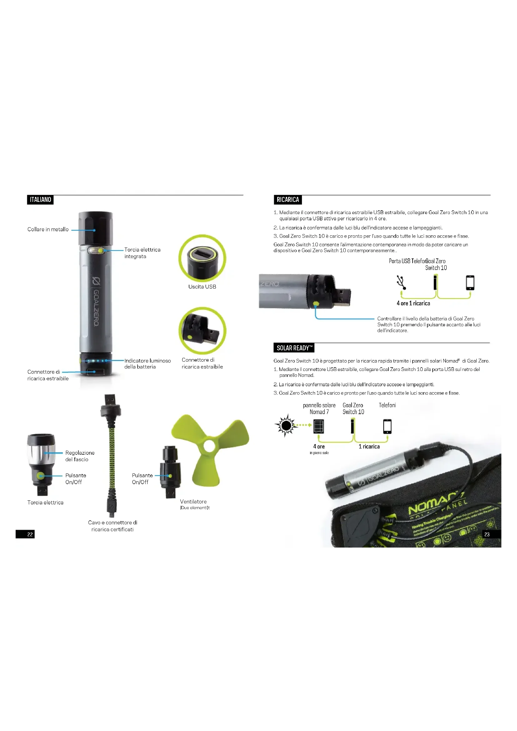 Ventilatore 5 ore Torcia elettrica 4 ore Telefoni 1 ricarica Tablet 25% di ricarica Goal Zero Switch 10 è progettato per ricaricare telecamere POV, telefoni cellulari e altri dispositivi portatili provvisti di alimentazione USB.Cavi certificatiGoal Zero Switch 10 è dotato di cavi certificati per la ricarica efficiente dei dispositivi.1. Collegare il cavo in dotazione all’uscita USB di Goal Zero Switch 10.2. Con una mano sul cavo far scorrere il collare in metallo di una posizione verso l’alto e ruotare in senso antiorario fino a stringerlo. Fare attenzione a non stringere eccessivamente il collare.1. Collegare il cavo di ricarica del dispositivo all’uscita USB di Goal Zero Switch 10.2. Goal Zero Switch 10 avvierà la ricarica automaticamente quando il dispositivo viene collegato. TORCIA ELETTRICA La torcia elettrica Goal Zero Switch 10 è un’intensa luce a LED di 110 lumen con un fascio orientabile.1. Collegare lo strumento torcia elettrica all’uscita USB di Goal Zero Switch 10.2. Con una mano sulla torcia elettrica far scorrere il collare in metallo di una posizione verso l’alto e ruotare in senso antiorario fino a stringerlo.Torcia elettrica integrataGoal Zero Switch 10 è inoltre dotato di una piccola torcia elettrica incorporata. Per l’accensione e lo spegnimento premere leggermente il pulsante sulla luce.Torcia elettrica integrata