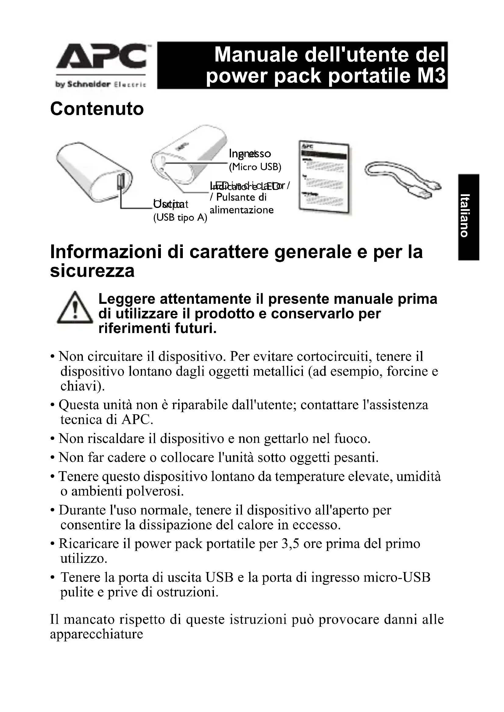 F)© 2015 APC by Schneider Electric. APC, il logo APC sono di proprietà di Schneider Electric Industries S.A.S o di aziende affiliate. Tutti gli altri marchi appartengono ai rispettivi proprietari. IT 990-5593 01/2015 Italiano Risoluzione dei problemi Assistenza clienti internazionale APC by Schneider Electric Per informazioni sull'assistenza clienti specifica per ogni Paese, fare riferimento al sito Web di APC by Schneider Electric all'indirizzo www.apc.com. Problema e possibile causa Soluzione Non è possibile caricare il mobile power pack Il caricatore USB potrebbe non funzionare correttamente o il computer essere in modalità di sospensione. Tentare con un altro caricatore USB o riattivare il computer dalla modalità di sospensione. Il cavo micro USB e i contatti del connettore sono consumati. Provare un nuovo connettore micro USB Il mobile power pack non è in grado di caricare alcuni dispositivi. Il mobile power pack potrebbe non aver riconosciuto e rilevato i dispositivi collegati ad esso. Alcuni cavi USB non originali potrebbero non funzionare correttamente con il battery pack M3. Per risolvere il problema, premere il tasto di alimentazione su M3 per avviare la ricarica del dispositivo. Se il battery pack non ricarica il dispositivo, sostituire il cavo non originale con il cavo originale fornito in dotazione con il dispositivo. Si è verificato un sovraccarico e il LED arancione di M3 sta lampeggiando. M3 sta ricaricando un dispositivo e la corrente in uscita tramite USB supera l'intervallo specificato. Scollegare il dispositivo in carica dal power pack M3. La vita utile del mobile power pack è scaduta o si è verificato un guasto. In caso di guasto del sistema, rivolgersi al proprio rivenditore APC by Schneider Electric o servizio di assistenza autorizzato APC by Schneider Electric.čeština Seznam položek Obecné a informace o bezpečnosti Před použitím produktu si pečlivě přečtěte tento návod k použití a uschovejte jej pro budoucí použití.