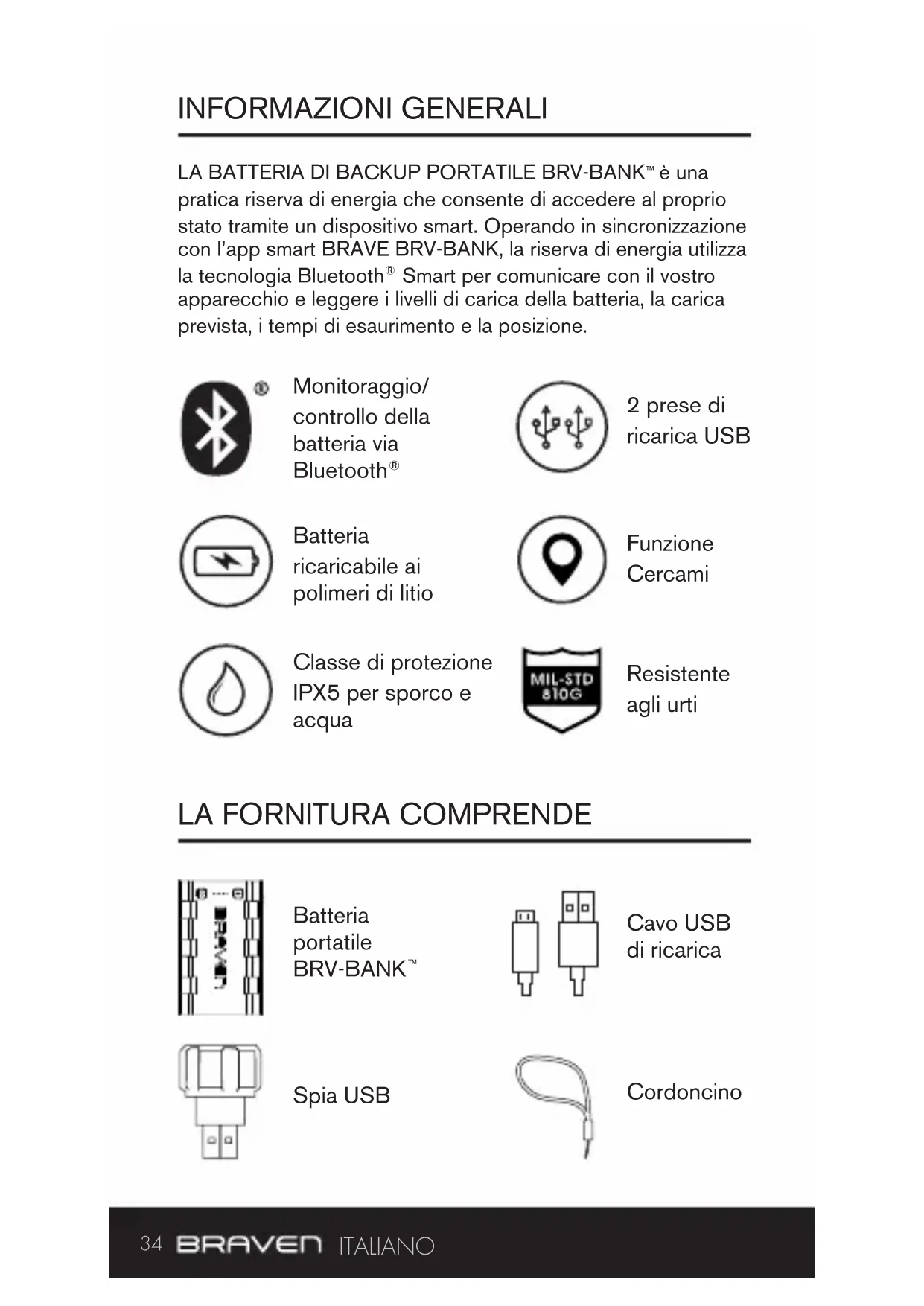 2 prese di ricarica USB Batteria ricaricabile ai polimeri di litio Funzione Cercami Classe di protezione IPX5 per sporco e acqua Resistente agli urti Cavo USB di ricarica Spia USB Cordoncino35 ITA BRAVEN.COM