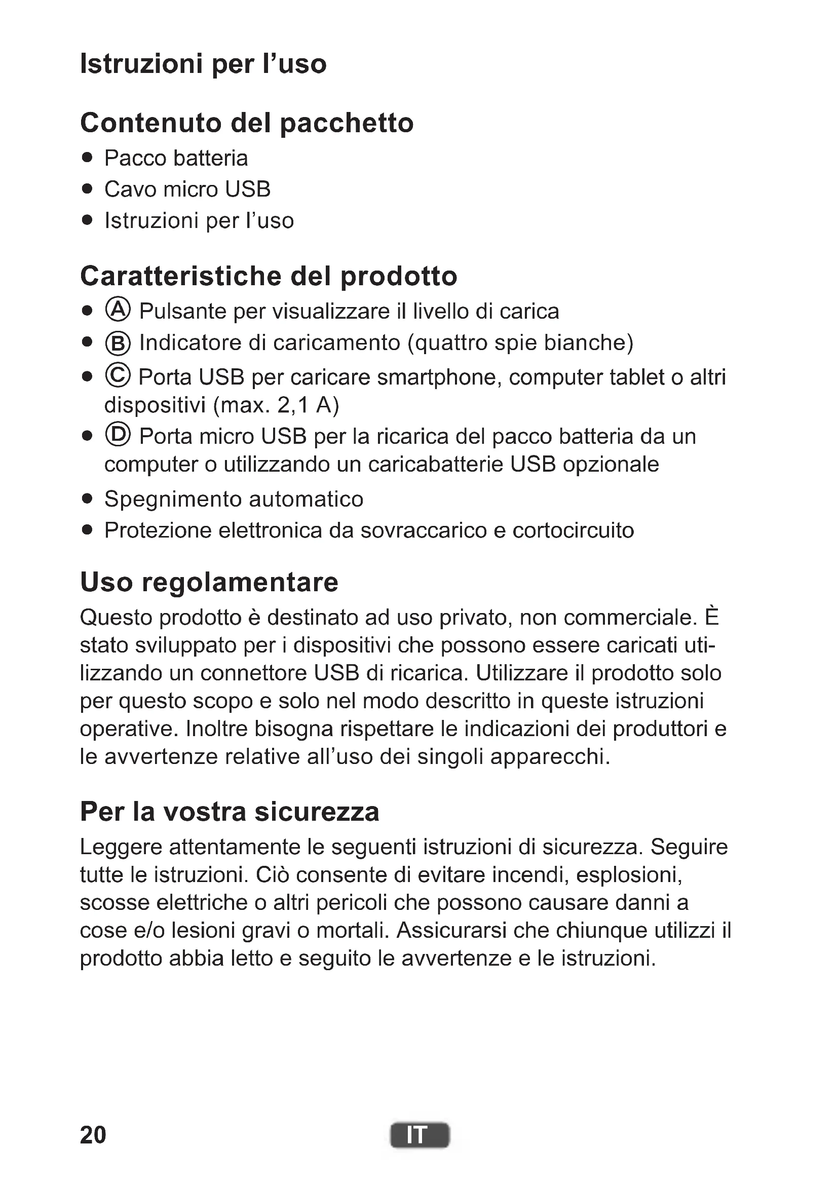 Protezione elettronica da sovraccarico e cortocircuito Uso regolamentare Questo prodotto è destinato ad uso privato, non commerciale. È stato sviluppato per i dispositivi che possono essere caricati uti- lizzando un connettore USB di ricarica. Utilizzare il prodotto solo per questo scopo e solo nel modo descritto in queste istruzioni operative. Inoltre bisogna rispettare le indicazioni dei produttori e le avvertenze relative all’uso dei singoli apparecchi. Per la vostra sicurezza Leggere attentamente le seguenti istruzioni di sicurezza. Seguire tutte le istruzioni. Ciò consente di evitare incendi, esplosioni, scosse elettriche o altri pericoli che possono causare danni a cose e/o lesioni gravi o mortali. Assicurarsi che chiunque utilizzi il prodotto abbia letto e seguito le avvertenze e le istruzioni.21