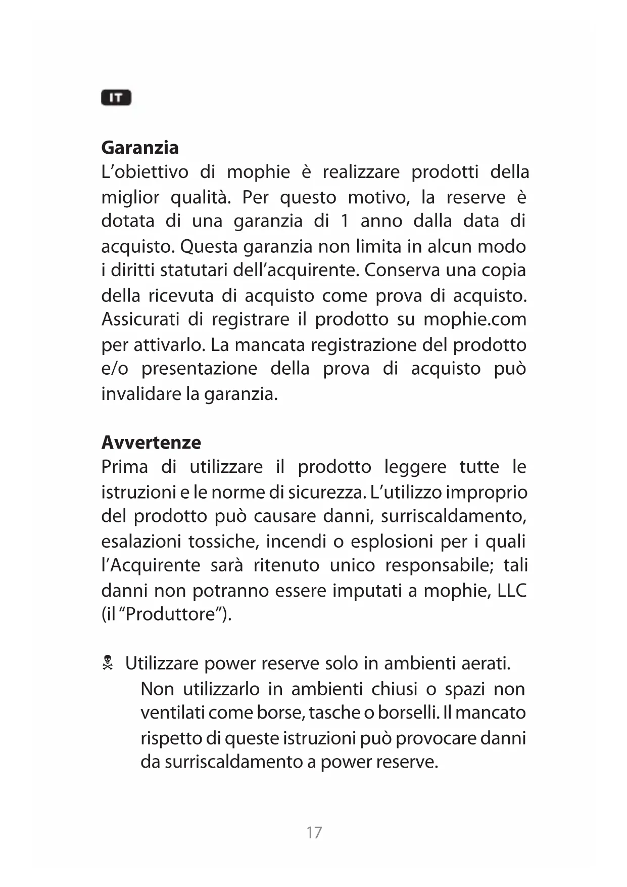 L'obiettivo di mophie è realizazare prodotti della miglior qualità. Per questo motivo, la reserve è dotata di una garanzia di 1 anno alla data di acquisto. Questa garanzia non limita in alcun modo i diritti statutari dell'acquirente. Conserva una copia della ricevuta di acquisto come prova di acquisto. Assicurati di registrarare il prodotto su mophie.com per attivarlo. La mancata registrazione del prodotto e/o presentazione della prova di acquisto può invalidare la garanzia.