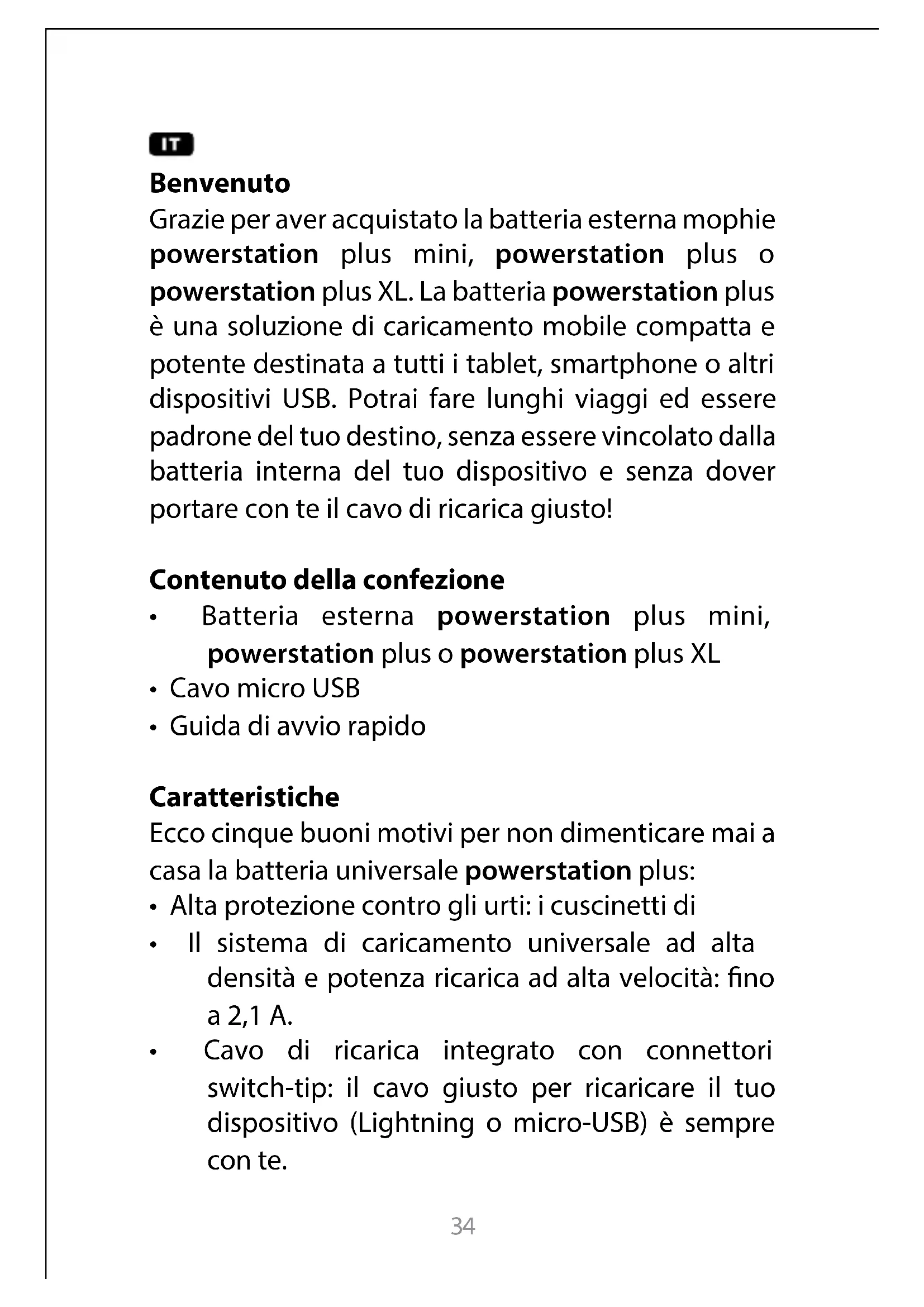 Grazie per aver acquistato la batteria esterna mophie powerstation plus mini, powerstation plus o powerstation plus XL. La batteria powerstation plus è una soluzione di caricamento mobile compatta e potente destinata a tutti i tablet, smartphone o altri dispositivi USB. Potrai fare lunghi viaggi ed essere padrone del tuo destino, senza essere vincolato dalla batteria interna del tuo dispositivo e senza dover portare con te il cavo di ricarica giusto!