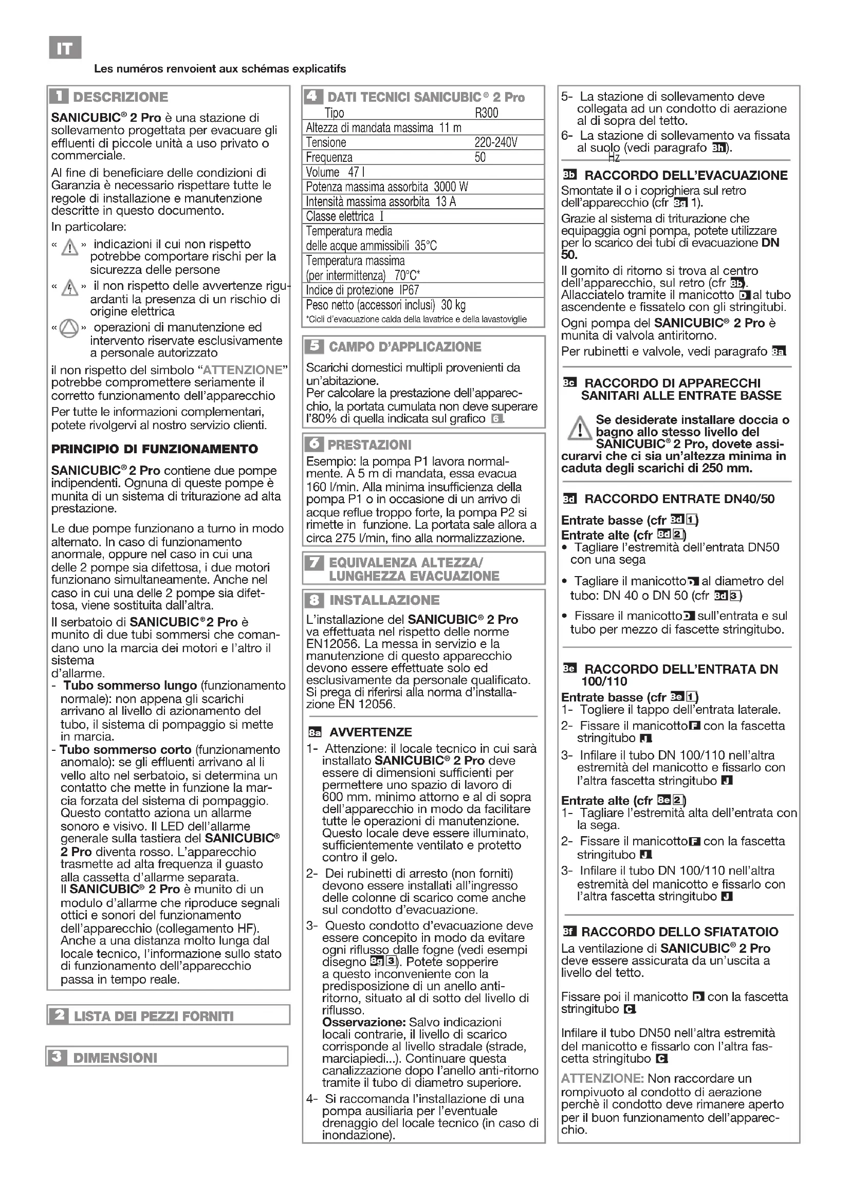 2 Pro è una stazione di sollevamento progettata per evacuare gli effluenti di piccole unità a uso privato o commerciale. Al fine di beneficiare delle condizioni di Garanzia è necessario rispettare tutte le regole di installazione e manutenzione descritte in questo documento. In particolare: