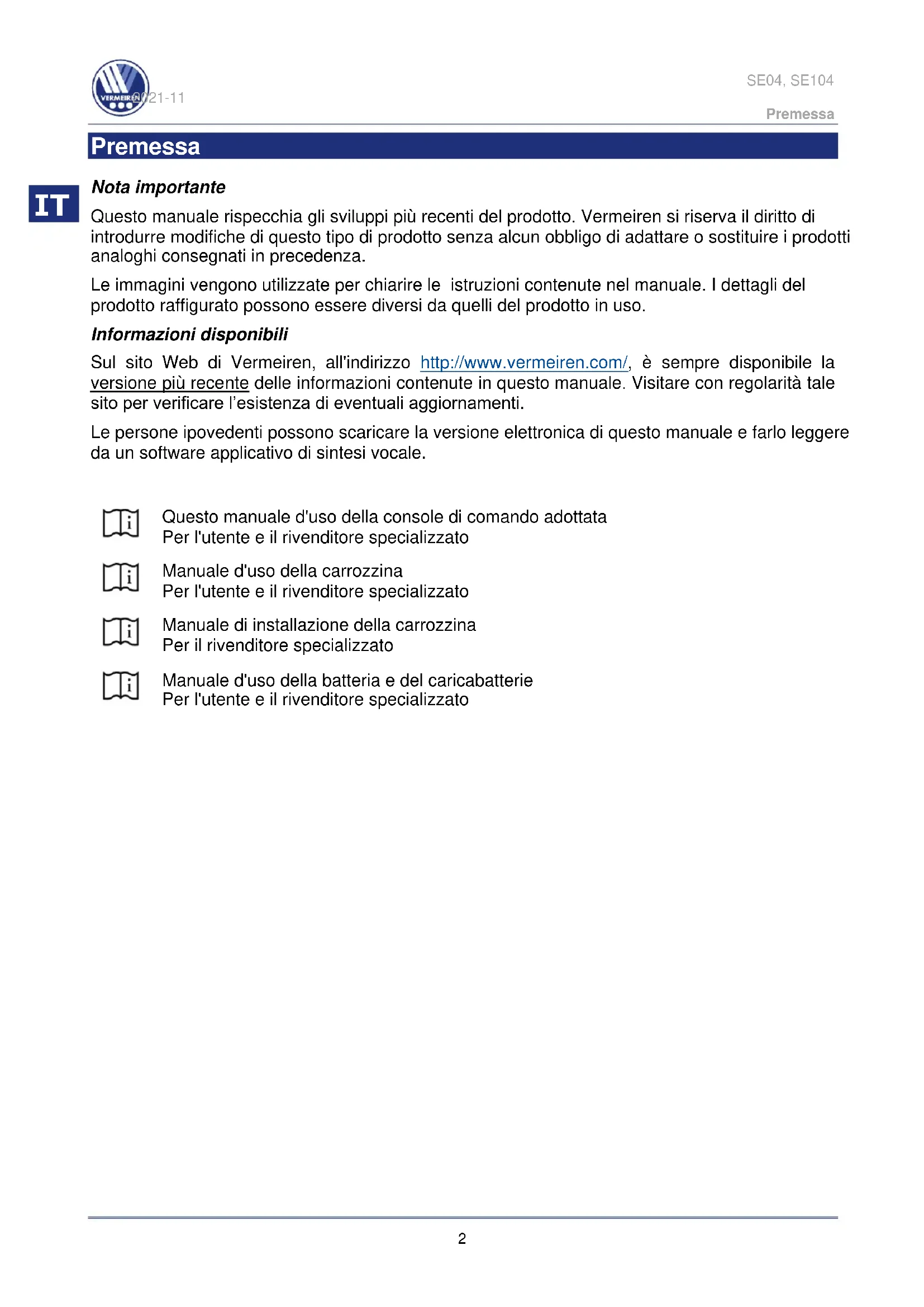 Vermeiren è responsabile degli aggiornamenti / delle riparazioni del software. Per eventuali adattamenti del software, rivolgersi a Vermeiren; vedere il suo sito Web http://www.vermeiren.com/SE04, SE104 2021-11 Guida