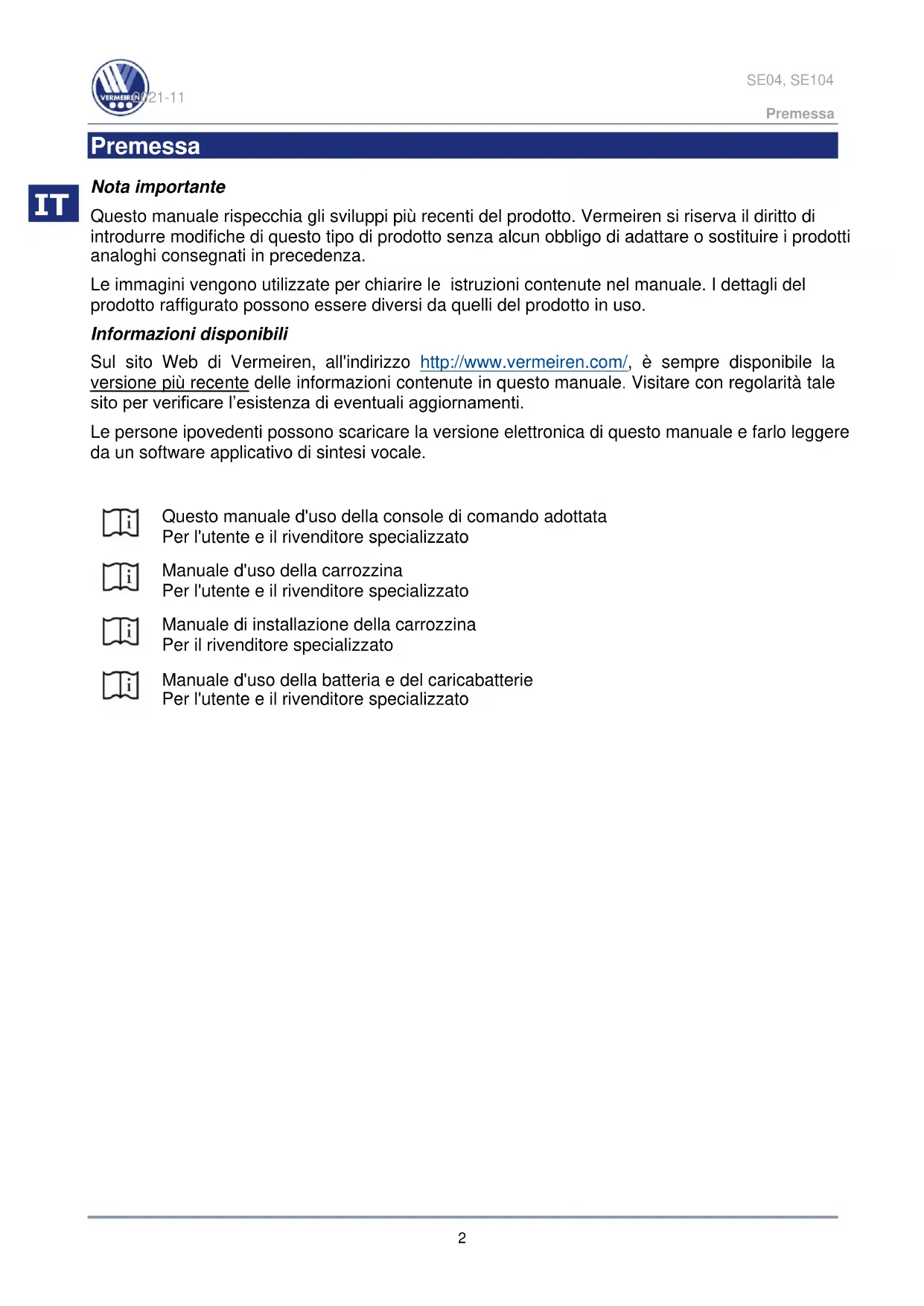Premessa Nota importante Questo manuale rispecchia gli sviluppi più recenti del prodotto. Vermeiren si riserva il diritto di introdurre modifiche di questo tipo di prodotto senza alcun obbligo di adattare o sostituire i prodotti analoghi consegnati in precedenza. Le immagini vengono utilizzate per chiarire le istruzioni contenute nel manuale. I dettagli del prodotto raffigurato possono essere diversi da quelli del prodotto in uso. Informazioni disponibili Sul sito Web di Vermeiren, all'indirizzo http://www.vermeiren.com/, è sempre disponibile la versione più recente delle informazioni contenute in questo manuale. Visitare con regolarità tale sito per verificare l’esistenza di eventuali aggiornamenti. Le persone ipovedenti possono scaricare la versione elettronica di questo manuale e farlo leggere da un software applicativo di sintesi vocale.