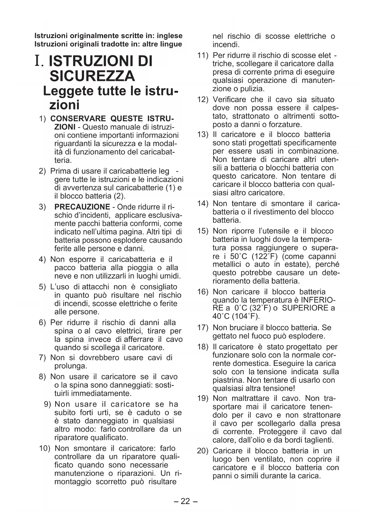 teria. Un cortocircuito del blocco batteria può causare un grande flusso di corrente, surriscaldamenti e bruciature. 22) NOTA: Se il cavo di corrente di que- sto apparecchio è danneggiato, deve essere sostituito solo presso un cen- tro riparazioni autorizzato dal fabbri- cante perché sono necessari speciali attrezzi su misura.