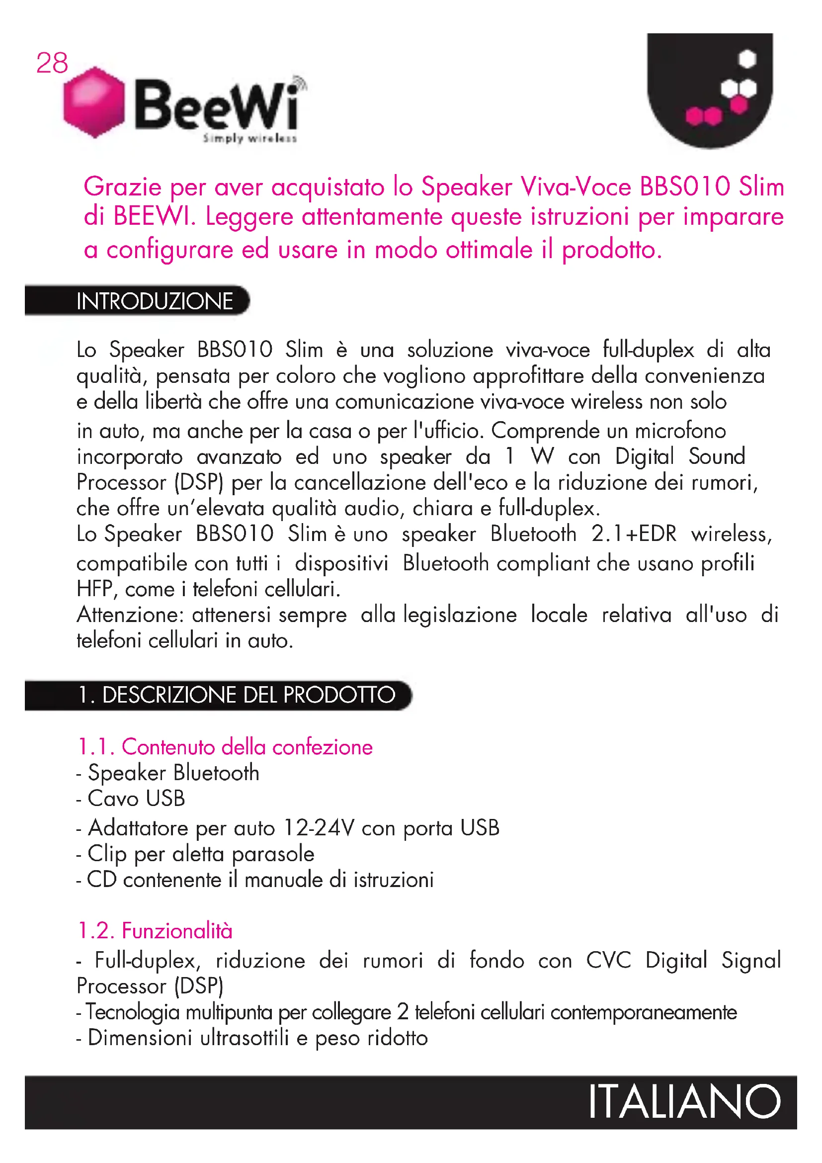 Caratteristiche Bluetooth Bluetooth V2.1+EDR Profili Bluetooth HSP - HFP1.5 Banda di frequenza Banda ISM 2,4GHz~2,48 GHz Classe di potenza e campo Classe 2, fino a 10 metri N° dispositivi accoppiati Fino a 8 dispositivi Potenza d'uscita audio max 1W Durata in stand-by Fino a 1000 ore (40 giorni) Durata in conversazione Fino a 5 ore Batteria Ricaricabile, Li-polimero 340mAH Tempo di ricarica batteria Fino a 2 ore Dimensioni Lung. 100 x Larg. 48W x Prof. 8 mm Peso 42g ITALIANO30 2.1. Istallazione sull'auto Inserire la clip di metallo sul retro dello speaker e applicarla all'aletta parasole dell'auto. Assicurarsi che lo speaker sia attaccato saldamente e con il microfono diretto verso il conducente. 2.2. Carica Prima di utilizzare lo speaker per la prima volta, si raccomanda di caricare completamente la batteria. La normale durata di ricarica completa è di circa 2 ore. Il Led rosso si accenderà durante la ricarica e si spegnerà quando sarà terminata. IMPORTANTE: - La durata della ricarica potrebbe richiedere alcuni minuti supplementari se lo speaker non è stato utilizzato per molto tempo oppure se la batteria si è completamente scaricata. - Per prolungare la durata di vita della batteria, si raccomanda di ricaricare lo speaker non appena compare l'indicatore di batteria scarica. 2.3. Accensione/spegnimento Accensione: mantenere premuto il tasto MFB per 3 secondi fino a sentire un breve bip. L'indicatore luminoso Led blu comincia a lampeggiare e lo speaker si connette automaticamente al telefono cellulare precedentemente accoppiato. Spegnimento: mantenere premuto il tasto MFB per 3 secondi fino a sentire un breve bip. L'indicatore luminoso Led blu si spegne. 2.4. Accoppiamento e connessione Fare riferimento alla procedura di accoppiamento Bluetooth nel manuale di istruzioni del telefono cellulare. Con lo speaker spento, premere a lungo il tasto MFB, per circa 5 secondi, fino a quando l'indicatore luminoso lampeggia alternativamente in rosso e blu, quindi rilasciare il tasto. Il lampeggiamento alternato indica che lo speaker è in modalità accoppiamento. Cercare i dispositivi Bluetooth sul telefono, selezionare sul display “BeeWi BBS010” e digitare il codice “0000” per aggiungere lo speaker alla lista
