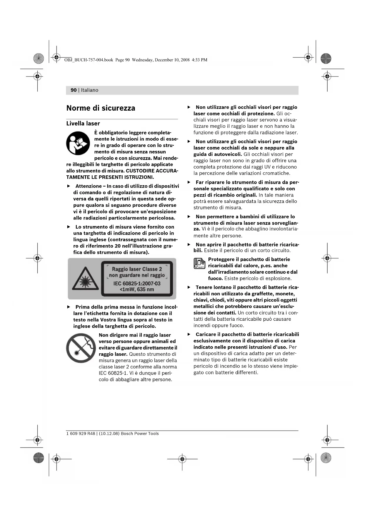 <1mW, 635 nm OBJ_BUCH-757-004.book Page 90 Wednesday, December 10, 2008 4:33 PMItaliano | 91 Bosch Power Tools 1 609 929 R48 | (10.12.08) Caricabatterie Leggere tutte le avvertenze di pericolo e le istruzioni operative. In caso di mancato rispetto delle avvertenze di pericolo e delle istru- zioni operative si potrà creare il pe- ricolo di scosse elettriche, incendi e/o incidenti gravi. Custodire il caricabatteria al riparo dalla pioggia o dall’umidità. L’even- tuale infiltrazione di acqua in un carica- batteria va ad aumentare il rischio d’in- sorgenza di scosse elettriche. f Con la stazione di ricarica non caricare altre batterie. La stazione di ricarica è adatta esclu- sivamente per la carica del pacchetto di batte- rie ricaricabili Bosch che è impiegato nella li- vella laser. In caso di ricarica di altre batterie esiste il pericolo di incendio e esplosione. f Avere cura di mantenere il caricabatteria sempre pulito. Attraverso accumuli di sporci- zia si crea il pericolo di una scossa elettrica. f Prima di ogni impiego controllare il carica- batteria, il cavo e la spina. Non utilizzare il caricabatteria in caso doveste riscontrare dei danni. Non aprire mai personalmente il caricabatteria e farlo riparare soltanto da personale qualificato e soltanto con pezzi di ricambio originali. In caso di caricabatterie per batterie, cavi e spine danneggiate si au- menta il pericolo di una scossa elettrica. f Non utilizzare il caricabatteria su basi fa- cilmente infiammabili (p.es. carta, tessuti ecc.) oppure in ambienti infiammabili. Per via del riscaldamento del caricabatteria che si ha durante la fase di ricarica si viene a creare il pericolo di incendio. f In caso d’impiego errato si provoca il perico- lo di fuoriuscita di liquido dalla batteria rica- ricabile. Evitarne assolutamente il contatto. In caso di contatto accidentale, sciacquare accuratamente con acqua. Rivolgersi imme- diatamente al medico, qualora il liquido dovesse entrare in contatto con gli occhi. Il liquido fuoriuscito dalla batteria ricaricabile potrà causare irritazioni cutanee o ustioni. Ricevitore laser Un lavoro ottimale con lo stru- mento di misura è possibile esclu- sivamente se le istruzioni d’uso e le indicazioni operative sono state lette completamente e le istruzioni riportate vengono osservate rigorosa- mente. CUSTODIRE ACCURATAMENTE LE PRESENTI ISTRUZIONI. Non portare lo strumento di mi- sura in prossimità di pace-maker. Tramite la piastra magnetica 29 viene generato un campo che può pregiudicare il funzionamento di pace-maker. f Tenere lo strumento di misura lontano da supporti magnetici di dati e da apparecchi sensibili ai magneti. A causa dell’azione della piastra magnetica 29 possono verificarsi per- dite irreversibili di dati. Descrizione del funzionamento Si prega di aprire il risvolto di copertina con l’illustrazione della livella laser, del dispositivo di carica e del ricevitore laser e lasciarlo aperto mentre si leggono le istruzioni d’uso. Uso conforme alle norme Livella laser Lo strumento di misura è idoneo per il rileva- mento ed il controllo di proiezioni di altezze per- fettamente orizzontali, linee verticali, allinea- menti e punti di filo a piombo. Caricabatterie Utilizzare la stazione di ricarica esclusivamente se sono state completamente valutate tutte le funzioni e possono essere effettuate senza limi- tazioni oppure sono state mantenute le relative istruzioni. Ricevitore laser Lo strumento di misura è previsto per il rileva- mento veloce di raggi laser in rotazione. OBJ_BUCH-757-004.book Page 91 Wednesday, December 10, 2008 4:33 PM92 | Italiano 1 609 929 R48 | (10.12.08) Bosch Power Tools Componenti illustrati La numerazione dei componenti illustrati si riferi- sce alla rappresentazione della livella laser, del di- spositivo di carica e del ricevitore laser che si tro- va sulle pagine con la rappresentazione grafica. Livella laser/dispositivo di carica 1 Indicatore avvertenza urto 2 Tasto avvertenza urto 3 Indicatore sistema di autolivellamento 4 Tasto di accensione/spegnimento livella laser 5 Tasto per rotazione e selezione della velocità di rotazione 6 Raggio laser variabile 7 Lente di ricezione per comando a distanza 8 Uscita del raggio laser 9 Raggio a piombo 10 Testa rotante 11 Tasto per proiezioni del raggio lineare e selezione della lunghezza di raggio lineare 12 Indicatore dello stato di carica 13 Pacchetto di batterie ricaricabili* 14 Vano batterie 15 Bloccaggio del vano batterie 16 Bloccaggio del pacchetto di batterie ricaricabili* 17 Presa per la spina di ricarica* 18 Attacco treppiede 5/8" 19 Numero di serie livella laser 20 Targhetta di indicazione di pericolo del raggio laser 21 Dispositivo di carica* 22 Spina elettrica del dispositivo di carica* 23 Spina di ricarica* Ricevitore laser* 24 Bloccaggio del coperchio del vano batterie 25 Livella ricevitore laser 26 Tasto di accensione/spegnimento ricevitore laser 27 Tasto per regolazione precisione di misura 28 Tasto segnale acustico 29 Piastra magnetica 30 Marcatura del punto medio 31 Campo di ricezione del raggio laser 32 Display 33 Sede per il supporto 34 Coperchio del vano batterie 35 Numero di serie ricevitore laser 36 Vite per il fissaggio del supporto 37 Bordo superiore del supporto 39 Vite di fissaggio del supporto 40 Supporto 41 Livella supporto Elementi indicatori ricevitore laser a Visualizzazione regolazione «medio» b LED spia dello stato della batteria c Spia di rilevazione: alto d Visualizzazione segnale acustico e Spia di rilevazione del punto medio f Visualizzazione regolazione «preciso» g Spia di rilevazione: basso Accessori/parti di ricambio 38 Asta metrica telescopica per livella laser* 42 Occhiali visori per raggio laser* 43 Supporto da parete* (disponibile a partire dal 2009) 44 Piastra di misurazione con piedino* 45 Piastra di riscontro soffitti/controsoffitti* 46 Telecomando* (disponibile a partire dal 2009) 47 Valigetta 48 Treppiede* *L’accessorio illustrato oppure descritto non è
