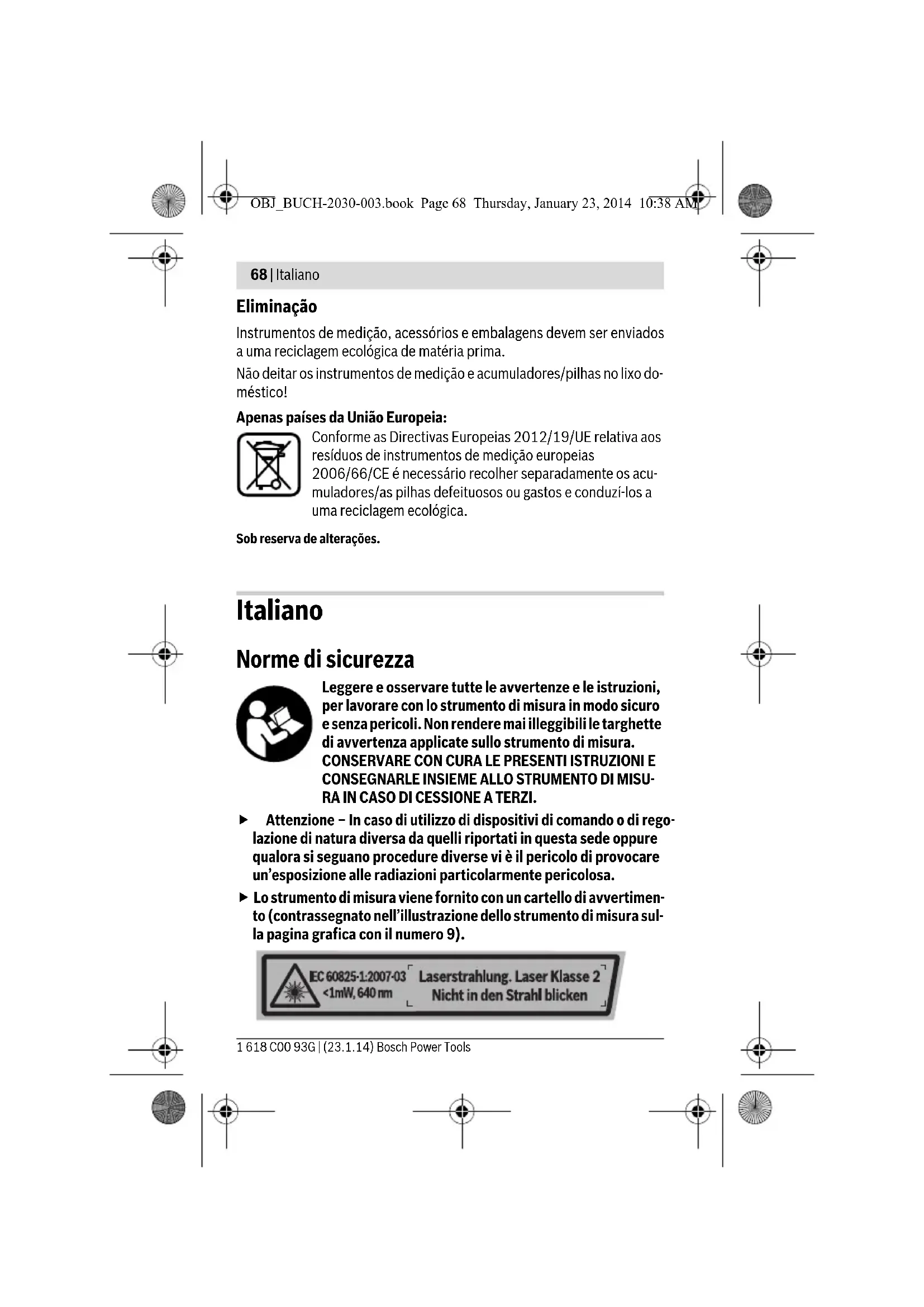 Temperatura di esercizio +10 °C...+40 °C A) Dopo la calibratura a 0 ° e 90 ° con errore di pendenza aggiuntivo di max. ±0,02°/gradi fino a 90°. B) Tramite 25 °C graduale peggioramento Per un’inequivocabile identificazione del Vostro strumento di misura fate riferimento al numero di serie 10 riportato sulla targhetta di costruzione. OBJ_BUCH-2030-003.book Page 71 Thursday, January 23, 2014 10:38 AM72 | Italiano 1 618 C00 93G | (23.1.14) Bosch Power Tools Montaggio Applicazione/sostituzione delle batterie Per il funzionamento dello strumento di misura si consiglia l’impiego dei batterie alcaline al manganese. Per aprire il coperchio del vano batterie 7 premere sul bloccaggio 8 e sol- levare il coperchio del vano batterie. Inserire le batterie, facendo attenzio- ne alla corretta polarizzazione, conformemente all’illustrazione riportata sul lato interno del coperchio del vano batterie. Sostituire sempre contemporaneamente tutte le batterie. Utilizzare esclusivamente batterie che siano di uno stesso produttore e che abbiano la stessa capacità. In caso di non utilizzo per periodi di tempo molto lunghi, estrarre le batterie dallo strumento di misura. In caso di periodi di deposito molto lunghi, le batterie possono subire corrosioni oppure e si possono scaricare. Temperatura di magazzino –20 °C...+70 °C Umidità relativa dell’aria max. 90% Classe laser