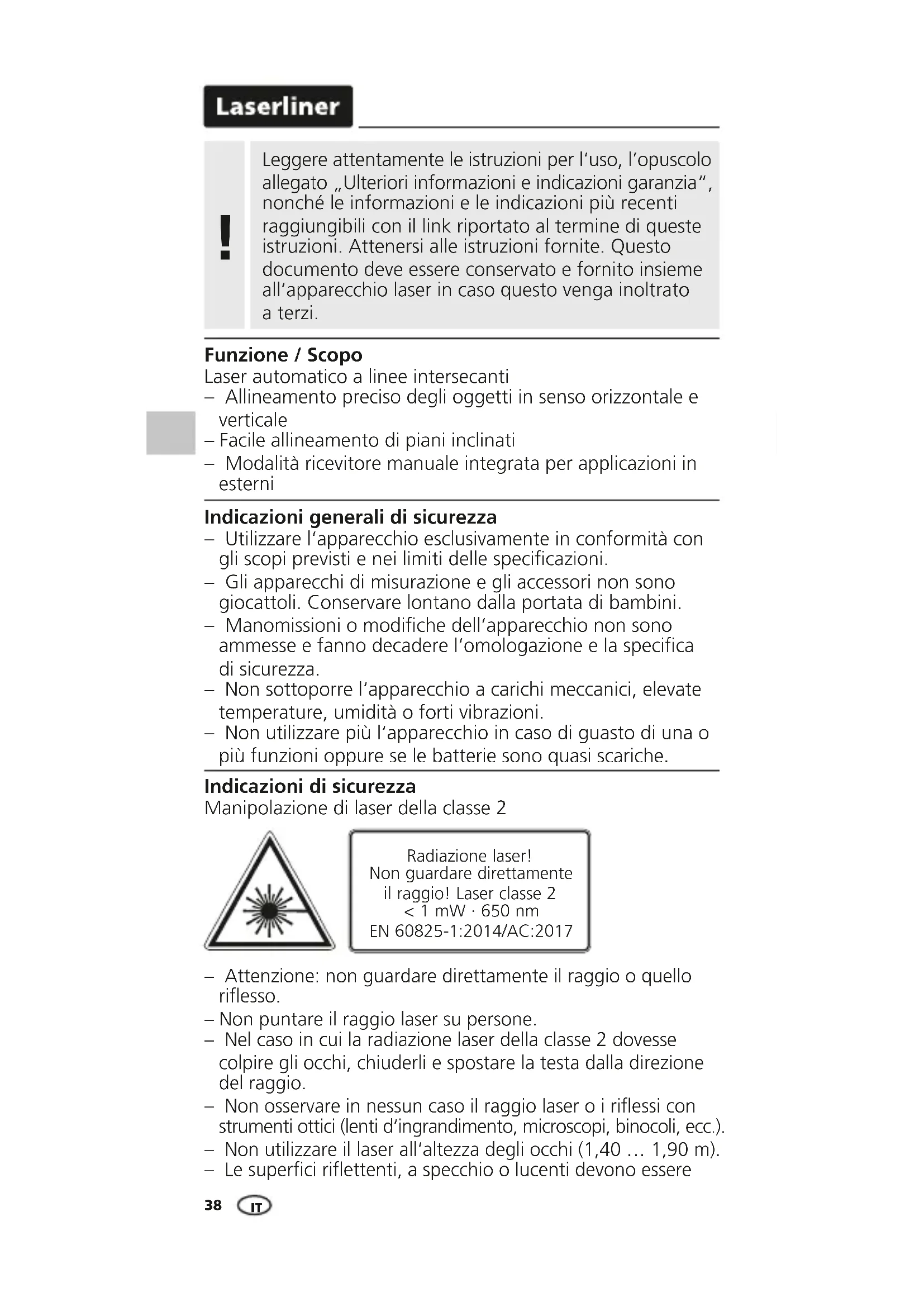 Funzione / Scopo Laser automatico a linee intersecanti – Allineamento preciso degli oggetti in senso orizzontale e verticale – Facile allineamento di piani inclinati – Modalità ricevitore manuale integrata per applicazioni in esterni Indicazioni generali di sicurezza – Utilizzare l‘apparecchio esclusivamente in conformità con gli scopi previsti e nei limiti delle specicazioni. – Gli apparecchi di misurazione e gli accessori non sono giocattoli. Conservare lontano dalla portata di bambini. – Manomissioni o modiche dell‘apparecchio non sono ammesse e fanno decadere l‘omologazione e la specica di sicurezza. – Non sottoporre l‘apparecchio a carichi meccanici, elevate temperature, umidità o forti vibrazioni. – Non utilizzare più l‘apparecchio in caso di guasto di una o più funzioni oppure se le batterie sono quasi scariche. Radiazione laser! Non guardare direttamente il raggio! Laser classe 2 < 1 mW · 650 nm EN 60825-1:2014/AC:2017 Indicazioni di sicurezza Manipolazione di laser della classe 2 – Attenzione: non guardare direttamente il raggio o quello riesso. – Non puntare il raggio laser su persone. – Nel caso in cui la radiazione laser della classe 2 dovesse colpire gli occhi, chiuderli e spostare la testa dalla direzione del raggio. – Non osservare in nessun caso il raggio laser o i riessi con strumenti ottici (lenti d‘ingrandimento, microscopi, binocoli, ecc.). – Non utilizzare il laser all‘altezza degli occhi (1,40 … 1,90 m). – Le superci riettenti, a specchio o lucenti devono essere ITSmartCross-Laser