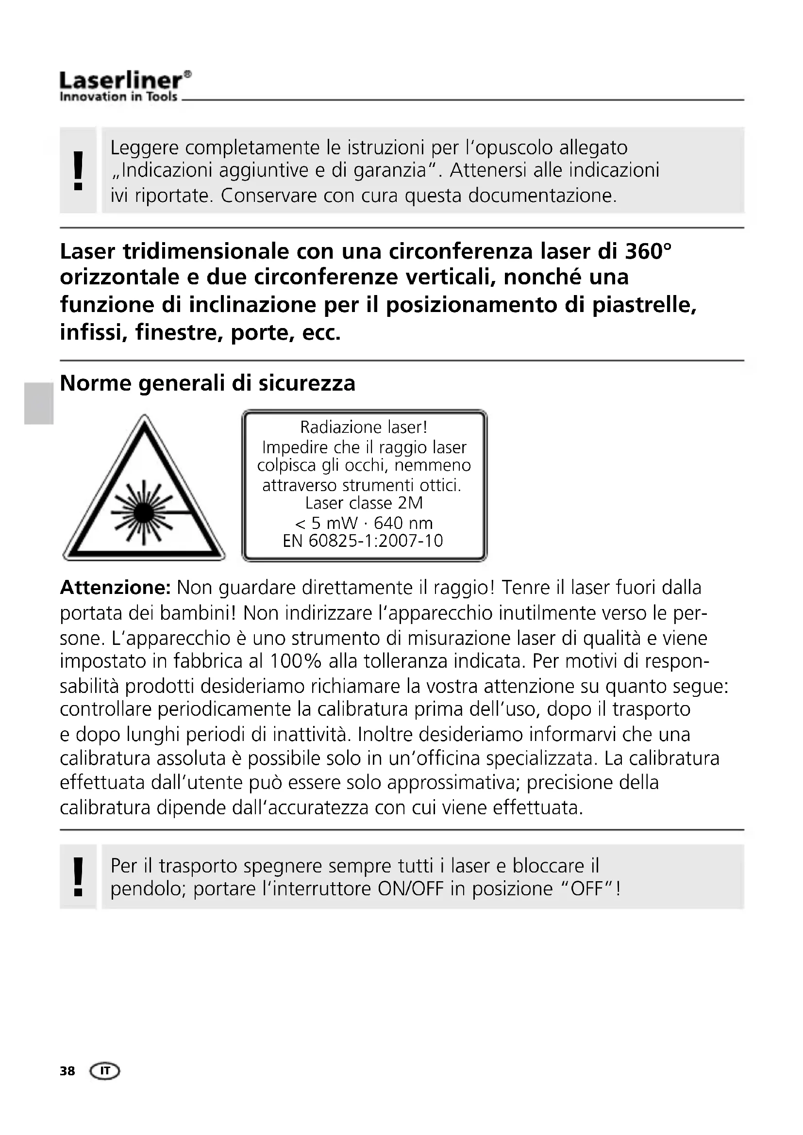 Norme generali di sicurezza Attenzione: Non guardare direttamente il raggio! Tenre il laser fuori dalla portata dei bambini! Non indirizzare l‘apparecchio inutilmente verso le per- sone. L‘apparecchio è uno strumento di misurazione laser di qualità e viene impostato in fabbrica al 100% alla tolleranza indicata. Per motivi di respon- sabilità prodotti desideriamo richiamare la vostra attenzione su quanto segue: controllare periodicamente la calibratura prima dell‘uso, dopo il trasporto e dopo lunghi periodi di inattività. Inoltre desideriamo informarvi che una calibratura assoluta è possibile solo in un‘ofcina specializzata. La calibratura effettuata dall‘utente può essere solo approssimativa; precisione della calibratura dipende dall‘accuratezza con cui viene effettuata. Radiazione laser! Impedire che il raggio laser colpisca gli occhi, nemmeno attraverso strumenti ottici. Laser classe 2M < 5 mW · 640 nm EN 60825-1:2007-10 Per il trasporto spegnere sempre tutti i laser e bloccare il pendolo; portare l‘interruttore ON/OFF in posizione “OFF”!