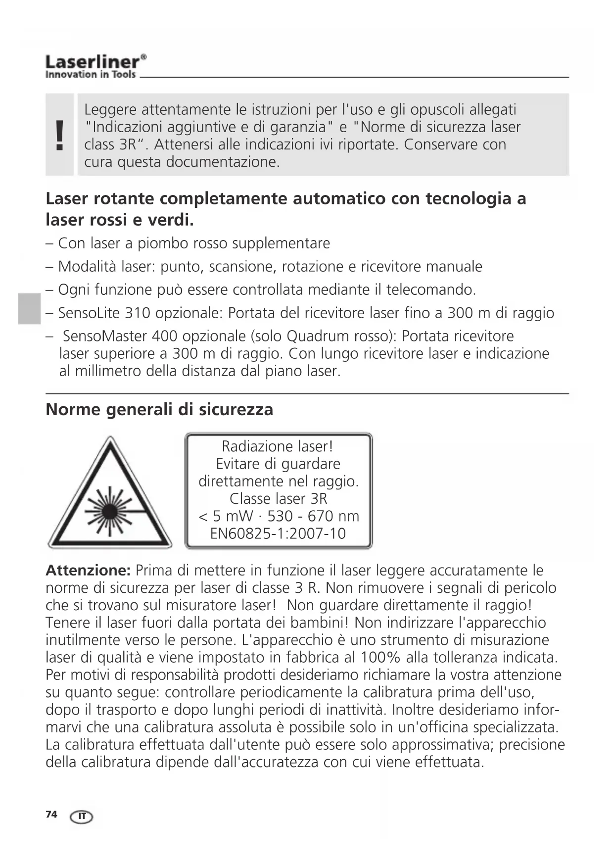 Modo de ajuste Al ajustar preste atención a la alineación del láser de rotación. Ajuste siempre todos los ejes. Ajuste del eje X Activar el modo de ajuste: encender el Quadrum. Pulsar simultánea- mente las teclas de Más/Menos del eje Y hasta que parpadee el LED de auto/man. Ajuste: cambiar el láser de su posición actual a la altura del punto de referencia A2 con las teclas Más/Menos del eje X. Anular el ajuste: apagar el aparato. Guardar: pulsar simultáneamente las teclas de Más/Menos del eje Y hasta que se apague el LED de auto/man. Ajuste de los ejes Y y Z Activar el modo de ajuste: encender el Quadrum. Pulsar simultánea- mente las teclas de Más/Menos del eje X hasta que parpadee el LED de inclinación (Tilt). Ajuste: cambiar el láser de su posición actual a la altura del punto de referencia A2 con las teclas Más/Menos del eje Y. Anular el ajuste: apagar el aparato. Guardar: pulsar simultáneamente las teclas de Más/Menos del eje X hasta que se apague el LED de inclinación (Tilt). Para realizar el ajuste del eje Z coloque el aparato en vertical y proceda como se ha descrito para ajustar el eje Y. X- / Y- / Z-Ejes ES74 Attenzione: Prima di mettere in funzione il laser leggere accuratamente le norme di sicurezza per laser di classe 3 R. Non rimuovere i segnali di pericolo che si trovano sul misuratore laser! Non guardare direttamente il raggio! Tenere il laser fuori dalla portata dei bambini! Non indirizzare l'apparecchio inutilmente verso le persone. L'apparecchio è uno strumento di misurazione laser di qualità e viene impostato in fabbrica al 100% alla tolleranza indicata. Per motivi di responsabilità prodotti desideriamo richiamare la vostra attenzione su quanto segue: controllare periodicamente la calibratura prima dell'uso, dopo il trasporto e dopo lunghi periodi di inattività. Inoltre desideriamo infor- marvi che una calibratura assoluta è possibile solo in un'officina specializzata. La calibratura effettuata dall'utente può essere solo approssimativa; precisione della calibratura dipende dall'accuratezza con cui viene effettuata. Radiazione laser! Evitare di guardare direttamente nel raggio. Classe laser 3R < 5 mW Ċ 530 - 670 nm EN60825-1:2007-10 Norme generali di sicurezza Laser rotante completamente automatico con tecnologia a laser rossi e verdi. – Con laser a piombo rosso supplementare – Modalità laser: punto, scansione, rotazione e ricevitore manuale – Ogni funzione può essere controllata mediante il telecomando. – SensoLite 310 opzionale: Portata del ricevitore laser fino a 300 m di raggio – SensoMaster 400 opzionale (solo Quadrum rosso): Portata ricevitore laser superiore a 300 m di raggio. Con lungo ricevitore laser e indicazione al millimetro della distanza dal piano laser. Leggere attentamente le istruzioni per l'uso e gli opuscoli allegati "Indicazioni aggiuntive e di garanzia" e "Norme di sicurezza laser class 3R“. Attenersi alle indicazioni ivi riportate. Conservare con cura questa documentazione.