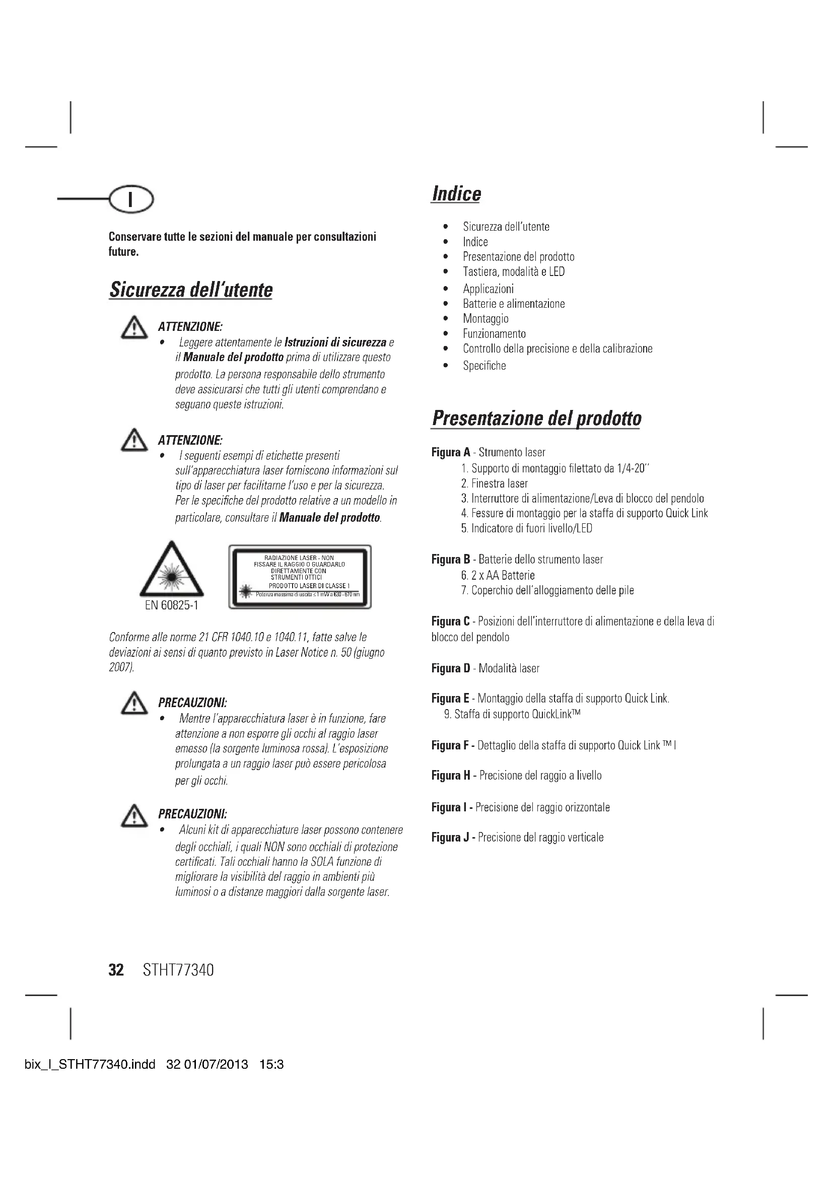Potenza massima di uscita ≤ 1 mW a 630 - 670 nm EN 60825-1 Conformeallenorme21CFR1040.10e1040.11,fattesalvele deviazioniaisensidiquantoprevistoinLaserNoticen.50(giugno 2007). PRECAUZIONI: