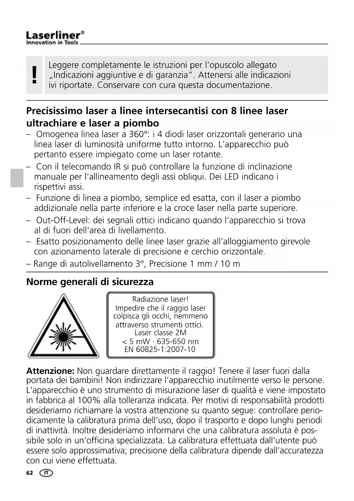 Datos técnicos Margen de auto-nivelado 3° Precisión ± 1 mm / 10 m Longitud de onda del láser Láser de líneas / láser de plomada 635 nm / 650 nm Láser de líneas / Potencia de salida del láser 2M / < 5 mW Láser de plomada / Potencia de salida del láser 2 / ≤ 1 mW Alimentación Batería de iones de litio Duración de la batería (con todos los láser encendidos) aprox. 8 h Duración de carga acumulador aprox. 6 h Peso (incl. batería de iones de litio) 1,6 kg Dimension (An x Al x F) 130 x 225 x 130 mm Temperatura de trabajo 0°C ... + 50°C Temperatura de almacenaje -10°C ... + 70°C Sujeto a modificaciones técnicas 04/2014 Control de la línea vertical: Coloque el aparato a unos 5 m de una pared. Fije una plomada con una cuerda de 2,5 m en la pared, la plomada debe poderse mover libremente. Conecte el aparato y oriente el láser vertical según la cuerda de plomada. La precisión se encuentra dentro de la tolerancia si la desviación entre la línea de láser y la cuerda de plomada no supera los ± 1,5 mm. Control de la línea horizontal: Coloque el aparato a unos 5 m de una pared y conecte la cruz del láser. Marque el punto B en la pared. Gire la cruz de láser unos 2,5 m hacia la derecha. Verifique si la línea horizontal del punto C se encuentra ± 2 mm en la misma altura que el punto B. Repita el proceso, pero ahora girando la cruz de láser hacia la izquierda. Compruebe regularmente la calibración antes del uso, después de transportes y de almacenajes prolongados. !62 Precisissimo laser a linee intersecantisi con 8 linee laser ultrachiare e laser a piombo – Omogenea linea laser a 360°: i 4 diodi laser orizzontali generano una linea laser di luminosità uniforme tutto intorno. L‘apparecchio può pertanto essere impiegato come un laser rotante. – Con il telecomando IR si può controllare la funzione di inclinazione manuale per l‘allineamento degli assi obliqui. Dei LED indicano i rispettivi assi. – Funzione di linea a piombo, semplice ed esatta, con il laser a piombo addizionale nella parte inferiore e la croce laser nella parte superiore. – Out-Off-Level: dei segnali ottici indicano quando l‘apparecchio si trova al di fuori dell‘area di livellamento. – Esatto posizionamento delle linee laser grazie all‘alloggiamento girevole con azionamento laterale di precisione e cerchio orizzontale. – Range di autolivellamento 3°, Precisione 1 mm / 10 m Norme generali di sicurezza Attenzione: Non guardare direttamente il raggio! Tenere il laser fuori dalla portata dei bambini! Non indirizzare l‘apparecchio inutilmente verso le persone. L‘apparecchio è uno strumento di misurazione laser di qualità e viene impostato in fabbrica al 100% alla tolleranza indicata. Per motivi di responsabilità prodotti desideriamo richiamare la vostra attenzione su quanto segue: controllare perio- dicamente la calibratura prima dell‘uso, dopo il trasporto e dopo lunghi periodi di inattività. Inoltre desideriamo informarvi che una calibratura assoluta è pos- sibile solo in un‘officina specializzata. La calibratura effettuata dall‘utente può essere solo approssimativa; precisione della calibratura dipende dall‘accuratezza con cui viene effettuata. Radiazione laser! Impedire che il raggio laser colpisca gli occhi, nemmeno attraverso strumenti ottici. Laser classe 2M < 5 mW · 635-650 nm EN 60825-1:2007-10 Leggere completamente le istruzioni per l‘opuscolo allegato „Indicazioni aggiuntive e di garanzia“. Attenersi alle indicazioni ivi riportate. Conservare con cura questa documentazione.