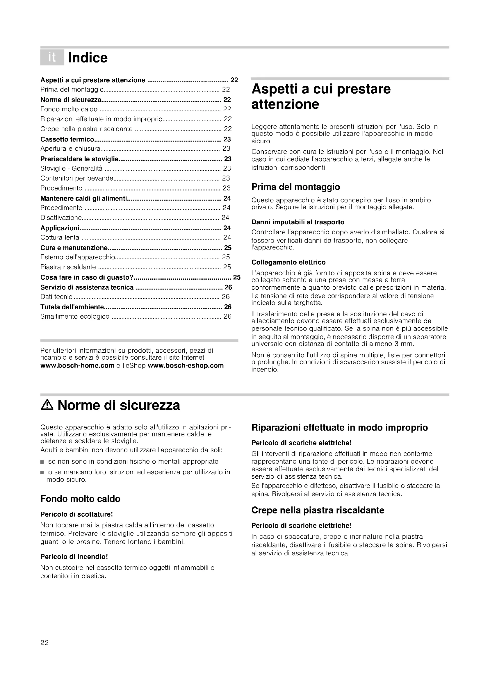 - Smaltimento ecologico Produktinfo Per ulteriori informazioni su prodotti, accessori, pezzi di ricambio e servizi è possibile consultare il sito Internet www.bosch-home.com e l'eShop www.bosch-eshop.com Aspetti a cui prestare attenzione Leggere attentamente le presenti istruzioni per l'uso. Solo in questo modo è possibile utilizzare l'apparecchio in modo sicuro. Conservare con cura le istruzioni per l'uso e il montaggio. Nel caso in cui cediate l'apparecchio a terzi, allegate anche le istruzioni corrispondenti. Prima del montaggio Questo apparecchio è stato concepito per l'uso in ambito privato. Seguire le istruzioni per il montaggio allegate. Danni imputabili al trasporto Controllare l'apparecchio dopo averlo disimballato. Qualora si fossero verificati danni da trasporto, non collegare l'apparecchio. Collegamento elettrico L'apparecchio è già fornito di apposita spina e deve essere collegato soltanto a una presa con messa a terra conformemente a quanto previsto dalle prescrizioni in materia. La tensione di rete deve corrispondere al valore di tensione indicato sulla targhetta. Il trasferimento delle prese e la sostituzione del cavo di allacciamento devono essere effettuati esclusivamente da personale tecnico qualificato. Se la spina non è più accessibile in seguito al montaggio, è necessario disporre di un separatore universale con distanza di contatto di almeno 3 mm. Non è consentito l'utilizzo di spine multiple, liste per connettori o prolunghe. In condizioni di sovraccarico sussiste il pericolo di incendio. ã=Norme di sicurezza Questo apparecchio è adatto solo all'utilizzo in abitazioni pri- vate. Utilizzarlo esclusivamente per mantenere calde le pietanze e scaldare le stoviglie. Adulti e bambini non devono utilizzare l'apparecchio da soli: ■ se non sono in condizioni fisiche o mentali appropriate ■ o se mancano loro istruzioni ed esperienza per utilizzarlo in modo sicuro. Fondo molto caldo Pericolo di scottature! Non toccare mai la piastra calda all'interno del cassetto termico. Prelevare le stoviglie utilizzando sempre gli appositi guanti o le presine. Tenere lontano i bambini. Pericolo di incendio! Non custodire nel cassetto termico oggetti infiammabili o contenitori in plastica. Riparazioni effettuate in modo improprio Pericolo di scariche elettriche! Gli interventi di riparazione effettuati in modo non conforme rappresentano una fonte di pericolo. Le riparazioni devono essere effettuate esclusivamente dai tecnici specializzati del servizio di assistenza tecnica. Se l'apparecchio è difettoso, disattivare il fusibile o staccare la spina. Rivolgersi al servizio di assistenza tecnica. Crepe nella piastra riscaldante Pericolo di scariche elettriche! In caso di spaccature, crepe o incrinature nella piastra riscaldante, disattivare il fusibile o staccare la spina. Rivolgersi al servizio di assistenza tecnica.23 Cassetto termico Il cassetto termico consente di preriscaldare le stoviglie o mantenere caldi gli alimenti. L'apparecchio riscalda soltanto se il cassetto è stato chiuso correttamente. Apertura e chiusura In caso di apparecchi senza maniglia: Per aprire o chiudere il cassetto, premere la parte centrale. Il cassetto fuoriesce leggermente permettendo di estrarlo senza difficoltà. Preriscaldare le stoviglie Preriscaldando le stoviglie, gli alimenti ivi contenuti non si raffredderanno troppo rapidamente. Le bevande restano calde più a lungo. Stoviglie - Generalità Il cassetto scaldavivande può contenere fino a un massimo di 25 kg. Per esempio, è possibile preriscaldare posate per 6 - 12 persone. Disposizione delle stoviglie Disporre le stoviglie in modo uniforme sull'intera superficie. I piatti disposti l'uno sull'altro si scaldano più lentamente rispetto alle stoviglie disposte singolarmente, per esempio 2 ciotole. Contenitori per bevande Per riscaldare i contenitori per bevande, quali le tazze per caffè espresso, usare il livello 2. ã=Pericolo di ustioni! Impostando il livello 3 oppure 4, i contenitori per bevande diventano molto caldi. Procedimento p. 26