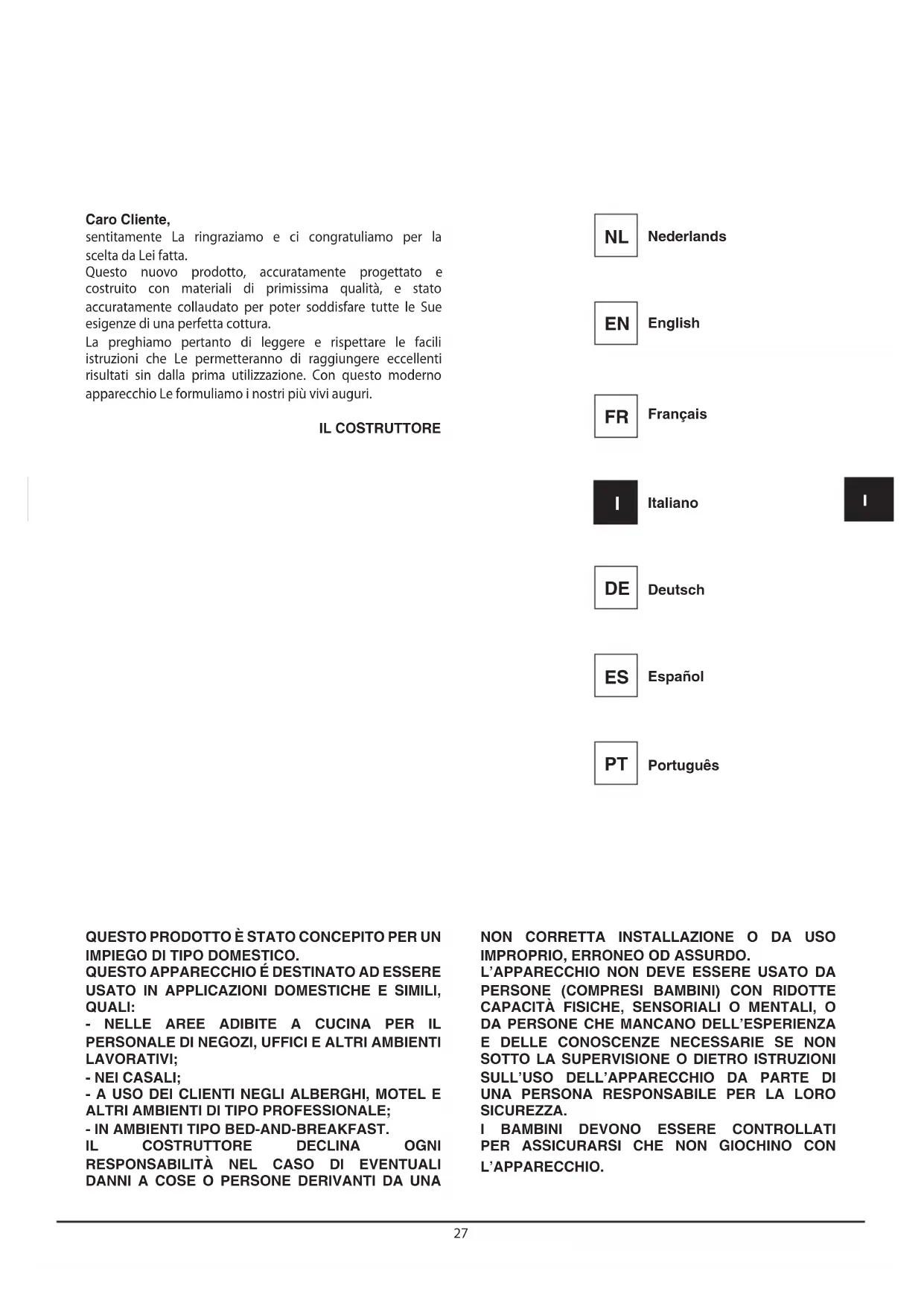 L’APPARECCHIO. Caro Cliente, sentitamente La ringraziamo e ci congratuliamo per la scelta da Lei fatta. Questo nuovo prodotto, accuratamente progettato e costruito con materiali di primissima qualità, e stato accuratamente collaudato per poter soddisfare tutte le Sue esigenze di una perfetta cottura. La preghiamo pertanto di leggere e rispettare le facili istruzioni che Le permetteranno di raggiungere eccellenti risultati sin dalla prima utilizzazione. Con questo moderno apparecchio Le formuliamo i nostri più vivi auguri. IL COSTRUTTORE Italiano