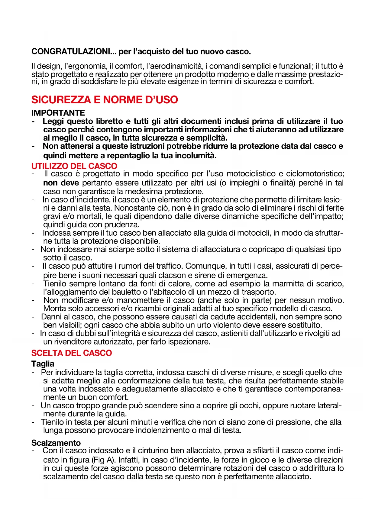 Taglia - Per individuare la taglia corretta, indossa caschi di diverse misure, e scegli quello che si adatta meglio alla conformazione della tua testa, che risulta perfettamente stabile una volta indossato e adeguatamente allacciato e che ti garantisce contemporanea- mente un buon comfort. - Un casco troppo grande può scendere sino a coprire gli occhi, oppure ruotare lateral- mente durante la guida. - Tienilo in testa per alcuni minuti e verica che non ci siano zone di pressione, che alla lunga possono provocare indolenzimento o mal di testa. Scalzamento - Con il casco indossato e il cinturino ben allacciato, prova a slarti il casco come indi- cato in gura (Fig A). Infatti, in caso d’incidente, le forze in gioco e le diverse direzioni in cui queste forze agiscono possono determinare rotazioni del casco o addirittura lo scalzamento del casco dalla testa se questo non è perfettamente allacciato.3 - Il casco non deve ruotare, muoversi liberamente sulla testa o slarsi. In caso contrario regola la lunghezza del cinturino o cambia taglia del casco. Ripeti di nuovo il test. Sistema di ritenzione - Il sistema di ritenzione (cinturino) è regolato di serie con una lunghezza standard; prima di utilizzarlo verica la corretta pre-regolazione. - Assicurati sempre che il cinturino sia bene allacciato e stretto in modo da tenere il casco fermo sulla testa. In qualsiasi caso, prima di partire, assicurati che il cinturino sia ben stretto sotto il mento, il più indietro possibile verso la gola, ma senza che sia scomodo. - La giusta tensione del cinturino ti deve permettere una respirazione e una deglutizione normale, ma senza riuscire a far passare un dito fra cinturino e gola. - Attenzione: il bottone eventualmente presente sul cinturino ha esclusivamente la funzione di impedire lo sventolio della parte terminale dello stesso, dopo che si è provveduto ad allacciarlo correttamente. VISIERA
