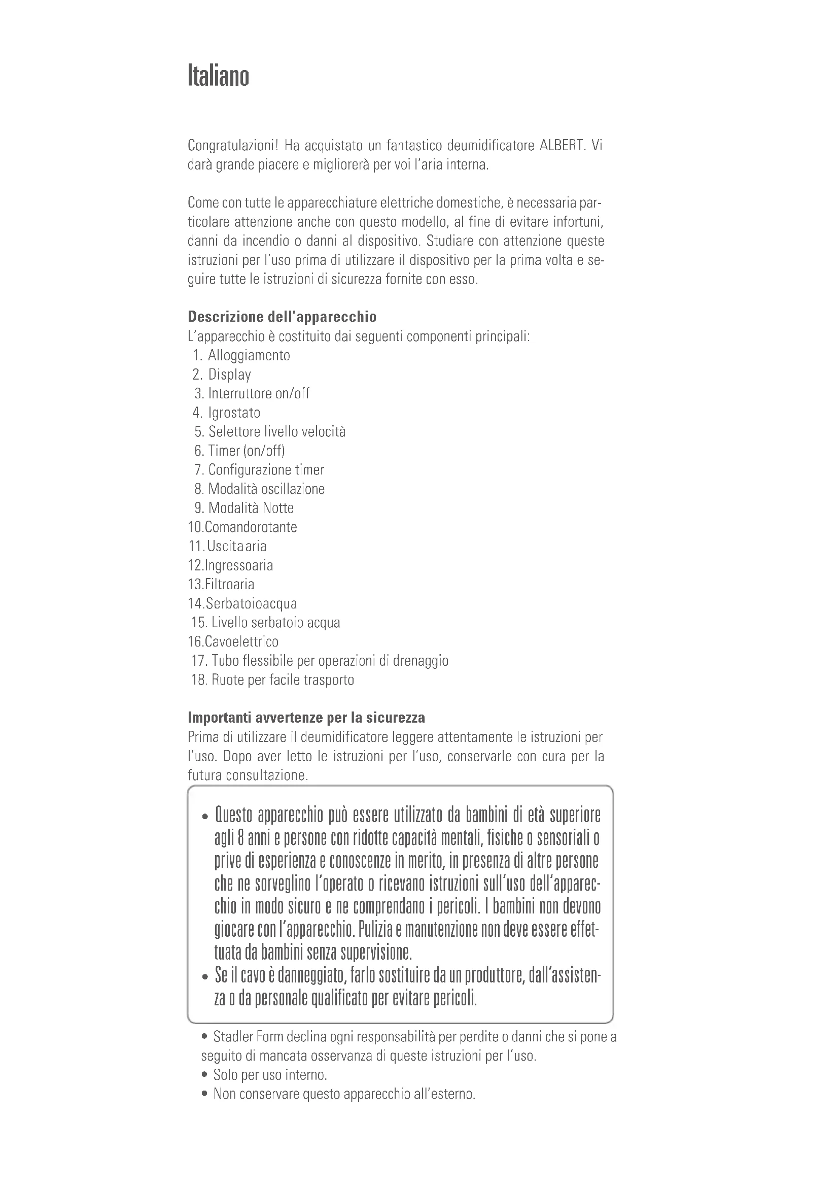 Scarica le istruzioni per il tuo Deumidificatore in formato PDF gratuitamente! Trova il tuo manuale Albert - STADLERFORM e riprendi in mano il tuo dispositivo elettronico. In questa pagina sono pubblicati tutti i documenti necessari per l'utilizzo del tuo dispositivo. Albert del marchio STADLERFORM.