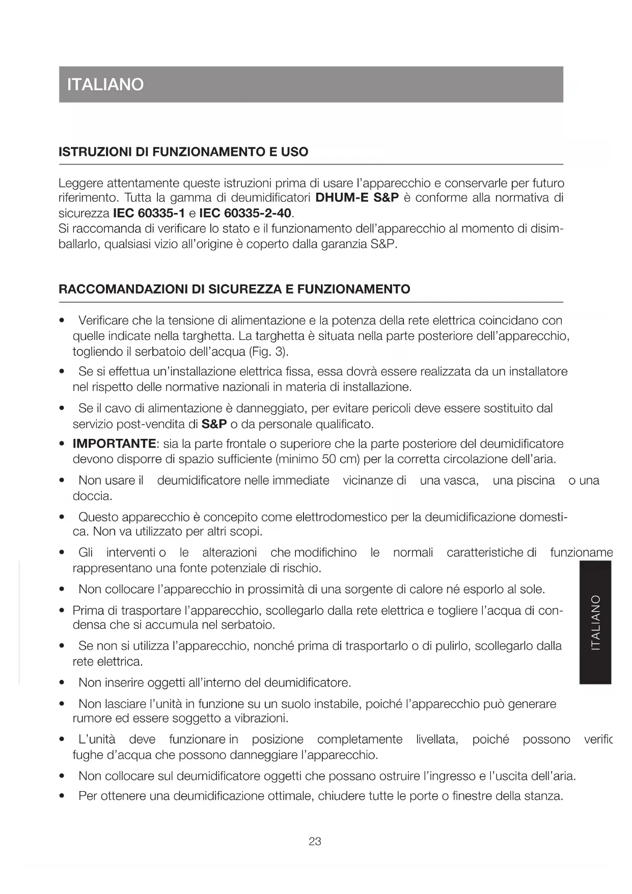 Leggere attentamente queste istruzioni prima di usare l'apparecchio e conservarle per futuro riferimento. Tutta la gamma di deumidificatori DHUM-E S&P è conforme alla normativa di sicurezza IEC 60335-1 e IEC 60335-2-40.