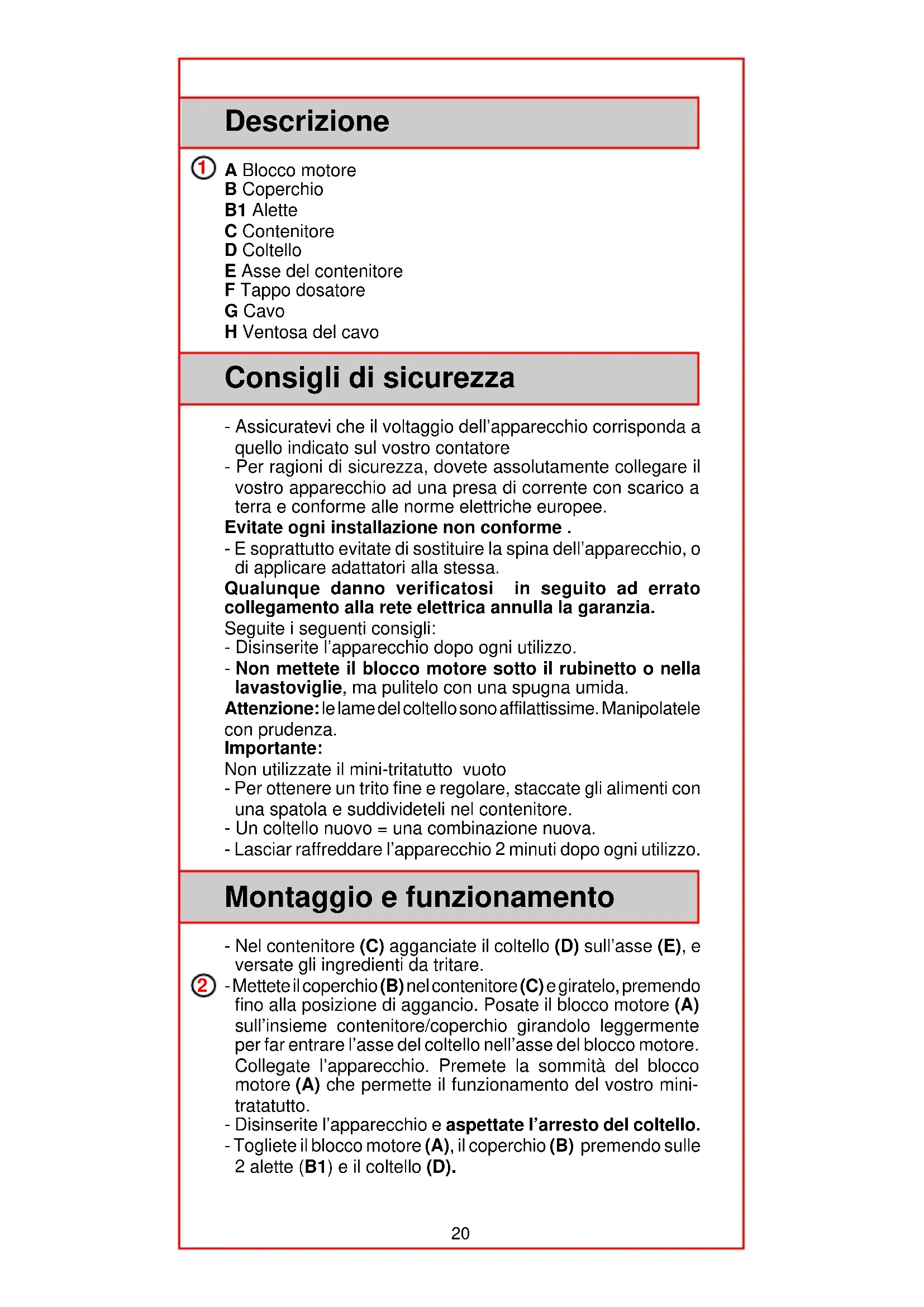 (m.u.v. magnetrons en ovens) of via de pakketdienst (magnetrons en ovens). Accessoires en onderdelen Onderdelen en accessoires zijn verkrijgbaar via Moulinex (adres: zie het Moulinex Service boekje) of via uw leverancier. Klantenservice Heeft u tips met betrekking tot het gebruik van uw Moulinex- apparaat? Een suggestie voor een nieuw recept? Neem dan kontakt op met de afdeling klantenservice van Moulinex, adres: zie het Moulinex Service boekje. Deskundige mensen kunnen u hier adviseren hoe u zo veel mogelijk profijt heeft van uw Moulinex-apparaat. Assortiment Moulinex biedt u een uitgebreid assortiment ingenieuze apparaten. Apparaten die onmisbaar zijn en die u dagelijks een helpende hand kunnen bieden.20 Descrizione A Blocco motore B Coperchio B1 Alette C Contenitore D Coltello E Asse del contenitore F Tappo dosatore G Cavo H Ventosa del cavo Consigli di sicurezza - Assicuratevi che il voltaggio dell’apparecchio corrisponda a quello indicato sul vostro contatore - Per ragioni di sicurezza, dovete assolutamente collegare il vostro apparecchio ad una presa di corrente con scarico a terra e conforme alle norme elettriche europee. Evitate ogni installazione non conforme . - E soprattutto evitate di sostituire la spina dell’apparecchio, o di applicare adattatori alla stessa. Qualunque danno verificatosi in seguito ad errato collegamento alla rete elettrica annulla la garanzia. Seguite i seguenti consigli: - Disinserite l’apparecchio dopo ogni utilizzo. - Non mettete il blocco motore sotto il rubinetto o nella lavastoviglie, ma pulitelo con una spugna umida. Attenzione: le lame del coltello sono affilattissime. Manipolatele con prudenza. Importante: Non utilizzate il mini-tritatutto vuoto - Per ottenere un trito fine e regolare, staccate gli alimenti con una spatola e suddivideteli nel contenitore. - Un coltello nuovo = una combinazione nuova. - Lasciar raffreddare l’apparecchio 2 minuti dopo ogni utilizzo. Montaggio e funzionamento - Nel contenitore (C) agganciate il coltello (D) sull’asse (E), e versate gli ingredienti da tritare. - Mettete il coperchio (B) nel contenitore (C) e giratelo, premendo fino alla posizione di aggancio. Posate il blocco motore (A) sull’insieme contenitore/coperchio girandolo leggermente per far entrare l’asse del coltello nell’asse del blocco motore. Collegate l’apparecchio. Premete la sommità del blocco motore (A) che permette il funzionamento del vostro mini- tratatutto. - Disinserite l’apparecchio e aspettate l’arresto del coltello. - Togliete il blocco motore (A), il coperchio (B) premendo sulle 2 alette (B1) e il coltello (D).