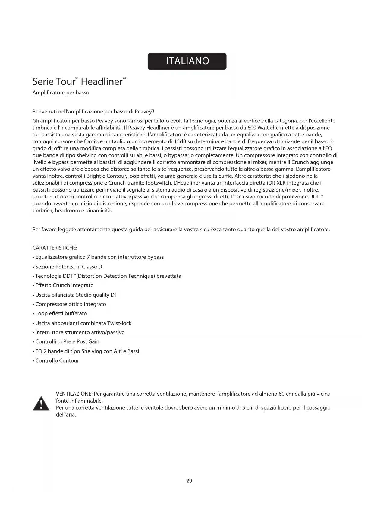 Gli amplificatori per basso Peavey sono famosi per la loro evoluta tecnologia, potenza al vertice della categoria, per l’eccellente timbrica e l’incomparabile affidabilità. Il Peavey Headliner è un amplificatore per basso da 600 Watt che mette a disposizione del bassista una vasta gamma di caratteristiche. L'amplificatore è caratterizzato da un equalizzatore grafico a sette bande, con ogni cursore che fornisce un taglio o un incremento di 15dB su determinate bande di frequenza ottimizzate per il basso, in grado di offrire una modifica completa della timbrica. I bassisti possono utilizzare l’equalizzatore grafico in associazione all’EQ due bande di tipo shelving con controlli su alti e bassi, o bypassarlo completamente. Un compressore integrato con controllo di livello e bypass permette ai bassisti di aggiungere il corretto ammontare di compressione al mixer, mentre il Crunch aggiunge un effetto valvolare d’epoca che distorce soltanto le alte frequenze, preservando tutte le altre a bassa gamma. L’amplificatore vanta inoltre, controlli Bright e Contour, loop effetti, volume generale e uscita cuffie. Altre caratteristiche risiedono nella selezionabili di compressione e Crunch tramite footswitch. L’Headliner vanta un’interfaccia diretta (DI) XLR integrata che i bassisti possono utilizzare per inviare il segnale al sistema audio di casa o a un dispositivo di registrazione/mixer. Inoltre, un interruttore di controllo pickup attivo/passivo che compensa gli ingressi diretti. L’esclusivo circuito di protezione DDT™ quando avverte un inizio di distorsione, risponde con una lieve compressione che permette all’amplificatore di conservare timbrica, headroom e dinamicità. Per favore leggete attentamente questa guida per assicurare la vostra sicurezza tanto quanto quella del vostro amplificatore. CARATTERISTICHE: