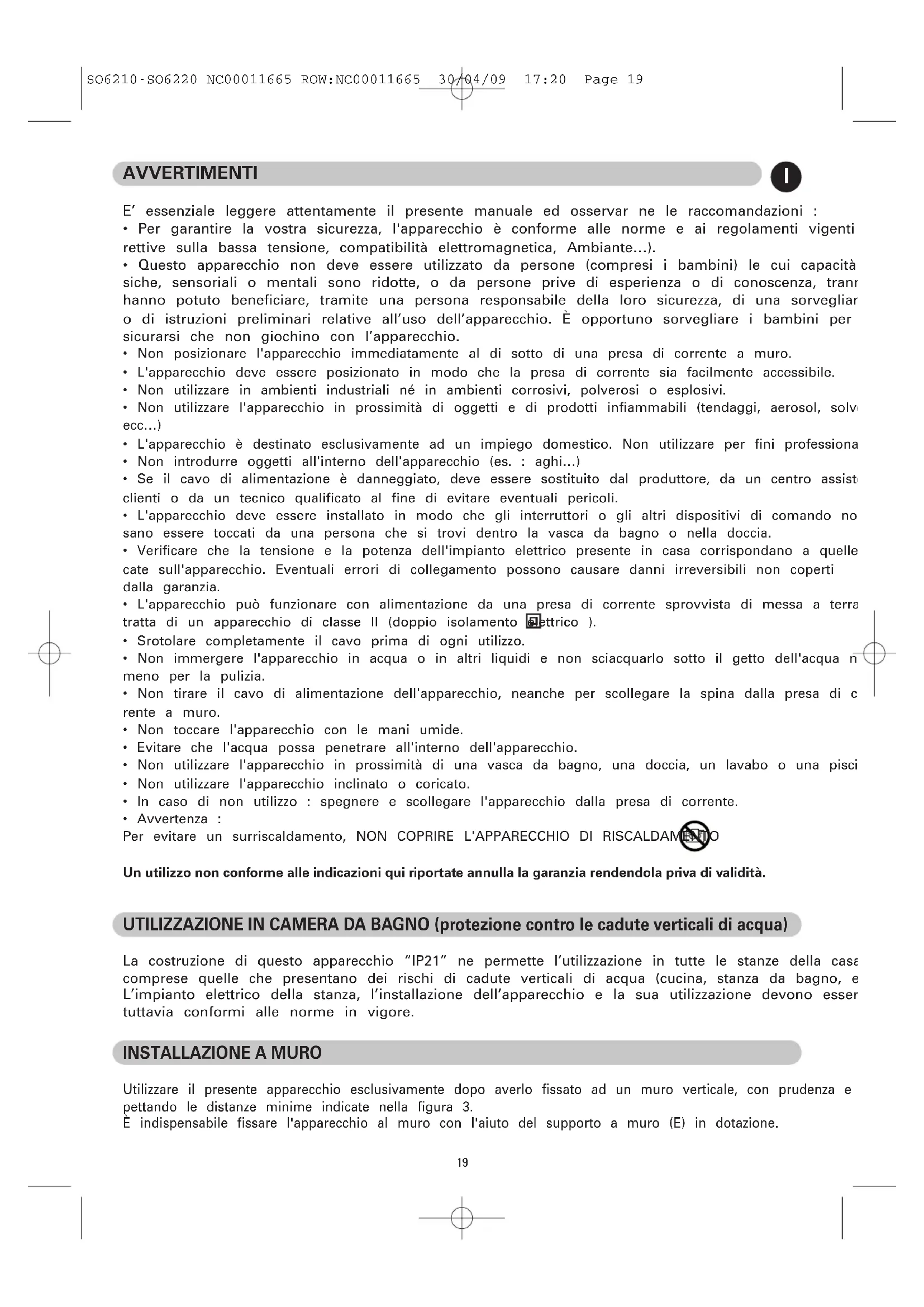SO6210-SO6220 NC00011665 ROW:NC00011665 30/04/09 17:20 Page 1819 AVVERTIMENTI E’ essenziale leggere attentamente il presente manuale ed osservar ne le raccomandazioni :