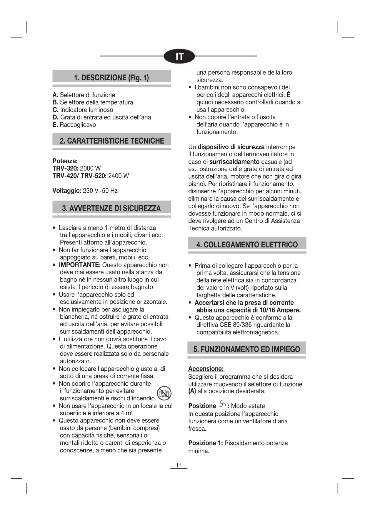 - Non coprire l’entrata o l’uscita dell’aria quando l’apparecchio è in funzionamento. Un dispositivo di sicurezza interrompe il funzionamento del termoventilatore in caso di surriscaldamento casuale (ad es.: ostruzione delle grate di entrata ed uscita dell'aria, motore che non gira o gira piano). Per ripristinare il funzionamento, disinserire l'apparecchio per alcuni minuti, eliminare la causa del surriscaldamento e collegarlo di nuovo. Se l'apparecchio non dovesse funzionare in modo normale, ci si deve rivolgere ad un Centro di Assistenza Tecnica autorizzato.
