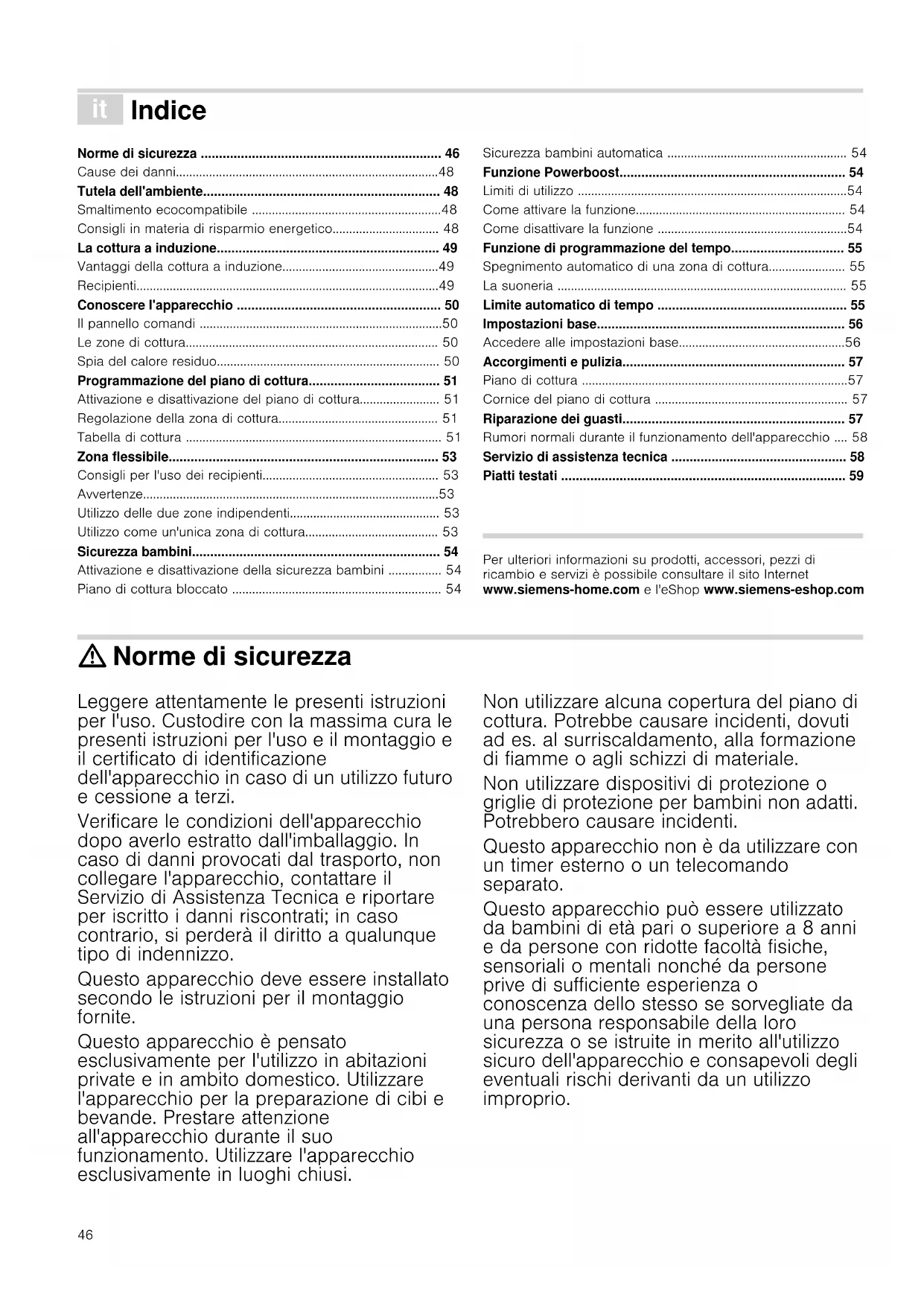 - Piatti testati Produktinfo Per ulteriori informazioni su prodotti, accessori, pezzi di ricambio e servizi è possibile consultare il sito Internet www.siemens-home.com e l'eShop www.siemens-eshop.com : Norme di sicurezza Leggere attentamente le presenti istruzioni per l'uso. Custodire con la massima cura le presenti istruzioni per l'uso e il montaggio e il certificato di identificazione dell'apparecchio in caso di un utilizzo futuro e cessione a terzi. Verificare le condizioni dell'apparecchio dopo averlo estratto dall'imballaggio. In caso di danni provocati dal trasporto, non collegare l'apparecchio, contattare il Servizio di Assistenza Tecnica e riportare per iscritto i danni riscontrati; in caso contrario, si perderà il diritto a qualunque tipo di indennizzo. Questo apparecchio deve essere installato secondo le istruzioni per il montaggio fornite. Questo apparecchio è pensato esclusivamente per l'utilizzo in abitazioni private e in ambito domestico. Utilizzare l'apparecchio per la preparazione di cibi e bevande. Prestare attenzione all'apparecchio durante il suo funzionamento. Utilizzare l'apparecchio esclusivamente in luoghi chiusi. Non utilizzare alcuna copertura del piano di cottura. Potrebbe causare incidenti, dovuti ad es. al surriscaldamento, alla formazione di fiamme o agli schizzi di materiale. Non utilizzare dispositivi di protezione o griglie di protezione per bambini non adatti. Potrebbero causare incidenti. Questo apparecchio non è da utilizzare con un timer esterno o un telecomando separato. Questo apparecchio può essere utilizzato da bambini di età pari o superiore a 8 anni e da persone con ridotte facoltà fisiche, sensoriali o mentali nonché da persone prive di sufficiente esperienza o conoscenza dello stesso se sorvegliate da una persona responsabile della loro sicurezza o se istruite in merito all'utilizzo sicuro dell'apparecchio e consapevoli degli eventuali rischi derivanti da un utilizzo improprio.47 I bambini non devono utilizzare l'apparecchio come un giocattolo. I bambini non devono né pulire né utilizzare l'apparecchio da soli a meno che non abbiano un'età superiore agli 8 anni e che siano assistiti da parte di un adulto. Tenere lontano dall'apparecchio e dal cavo di alimentazione i bambini di età inferiore agli 8 anni. Le persone che hanno subito l'impianto di un pace-maker o di un dispositivo medico simile devono fare particolarmente attenzione quando utilizzano o si avvicinano ai piani di cottura ad induzione. Consultare il medico o il fabbricante del dispositivo per assicurarsi che sia conforme alla normativa vigente e per informarsi sulle possibili incompatibilità. Pericolo di incendio! p. 59