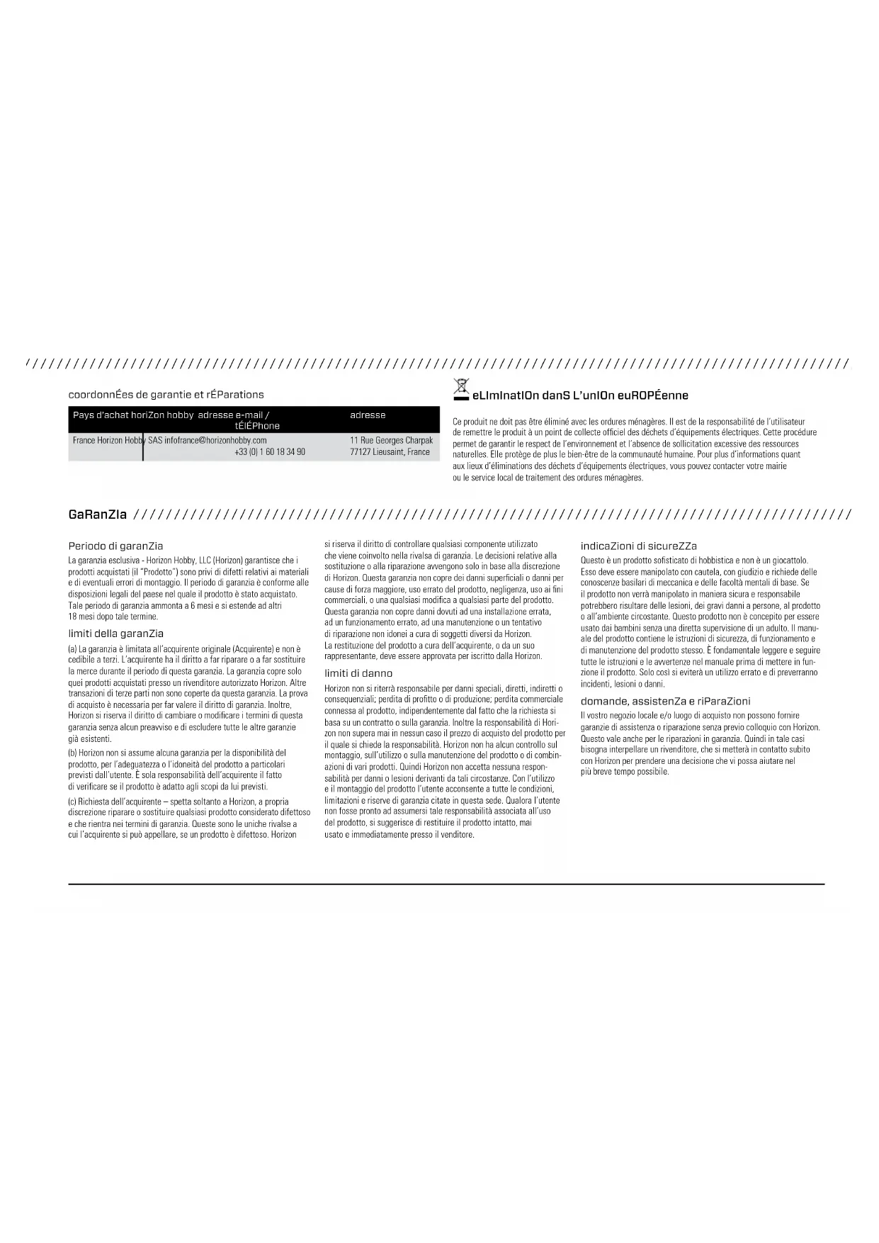 des dégâts matériels, des dommages collatéraux et des blessures graves OU engendrer une probabilité élevée de blessure superficielle. Age Recommandé: 14 ans et plus. Ceci n’est pas un jouet. / / / / / / / / / / / / / / / / / / / / / / / / / / / / / / / / / / / / / / / / / / / / / / / / / / / / / / / / / / / / / / / / / / / / / / / / / / / / / / / / / / / / / / / / / / / / / / / / / / / / / remarque Toutes les instructions, garanties et autres documents de garantie sont sujets à la seule discrétion de Horizon Hobby, LLC. Veuillez, pour une documentation produit bien à jour, visiter le site internet http://www.horizonhobby.com. PrécautionS et avertiSSementS liéS à la Sécurité FRIT » Questo modello funziona con comandi radio soggetti all’interferenza di altri dispositivi non controllabili dall’utente. Tale interferenza può provocare una momentanea perdita di controllo ed è pertanto consigliabile mantenere sempre una distanza di sicurezza attorno al modello per evitare il rischio di collisioni o lesioni. » Utilizzare sempre il modello in spazi aperti liberi da veicoli di grosse dimensioni, traffico e persone. » Seguire scrupolosamente le istruzioni e le avvertenze relative al modello e a tutti gli accessori (caricabatteria, pacchi batterie ricaricabili ecc.) utilizzati. » Tenere le sostanze chimiche, i componenti di piccole dimensioni o i componenti elettrici fuori dalla portata dei bambini. » L’umidità danneggia le parti elettroniche. Evitare il contatto con l’acqua di tutti i dispositivi che non sono stati specificatamente progettati per funzionare in ambiente umido. » Non mettere in bocca alcun componente del modello poiché potrebbe causare lesioni gravi o persino mortali. » Non utilizzare il modello se la carica delle batterie della trasmittente è insufficiente. registrate online il Vostro Prodotto Vaterra Per avere tutte le informazioni aggiornate sul prodotto. Visitate WWW.VATERRARC.COM cliccando sulla tab Support oggi stesso e seguire le istruzioni per registrare il vostro prodotto. AVVERTENZA: Leggere TUTTO il manuale di istruzioni e familiarizzare con le caratteristiche del prodotto prima di farlo funzionare. Un uso improprio del prodotto può causare danni al prodotto stesso e alle altre cose e gravi lesioni alle persone. Questo modello è un prodotto sofisticato per appassionati di modellismo. Deve essere azionato in maniera attenta e responsabile e richiede alcune conoscenze basilari di meccanica. L’uso improprio o irresponsabile di questo prodotto può causare lesioni alle persone e danni al prodotto stesso o alle altre cose. Questo prodotto non deve essere utilizzato dai bambini senza la diretta supervisione di un adulto. Non tentare di smontare, utilizzare componenti incompatibili o modificare il prodotto in nessun caso senza previa approvazione di Horizon Hobby, LLC. Questo manuale contiene le istruzioni per la sicurezza, l’uso e la manutenzione del prodotto. È fondamentale leggere e seguire tutte le istruzioni e le avvertenze del manuale prima di montare, impostare o utilizzare il prodotto, al fine di utilizzarlo correttamente e di evitare di causare danni alle cose o gravi lesioni alle persone. significato dei termini usati Nella documentazione relativa al prodotto vengono utilizzati i seguenti termini per indicare i vari livelli di pericolo potenziale durante l’uso del prodotto: AVVISO: Indica procedure che, se non debitamente seguite, possono determinare il rischio di danni alle cose E il rischio minimo o nullo di lesioni alle persone. ATTENZIONE: Indica procedure che, se non debitamente seguite, determinano il rischio di danni alle cose E di gravi lesioni alle persone. AVVERTENZA: Indica procedure che, se non debitamente seguite, determinano il rischio di danni alle cose, danni collaterali e gravi lesioni alle persone O il rischio elevato di lesioni superficiali alle persone. Limite minimo di età consigliato: Almeno 14 anni. Non è un giocattolo. / / / / / / / / / / / / / / / / / / / / / / / / / / / / / / / / / / / / / / / / / / / / / / / / / / / / / / / / / / / / / / / / / / / / / / / / / / / / / / / / / / / / / / / / / / / / / / / / / / / / / / / / aVViso Tutte le istruzioni, le garanzie e gli altri documenti pertinenti sono soggetti a cambiamenti a totale discrezione di Horizon Hobby, LLC. Per una documentazione aggiornata sul prodotto, visitare il sito horizonhobby.com e fare clic sulla sezione Support del prodotto. ulteriori Precauzioni Per la Sicurezza e avvertenze6 icon Key