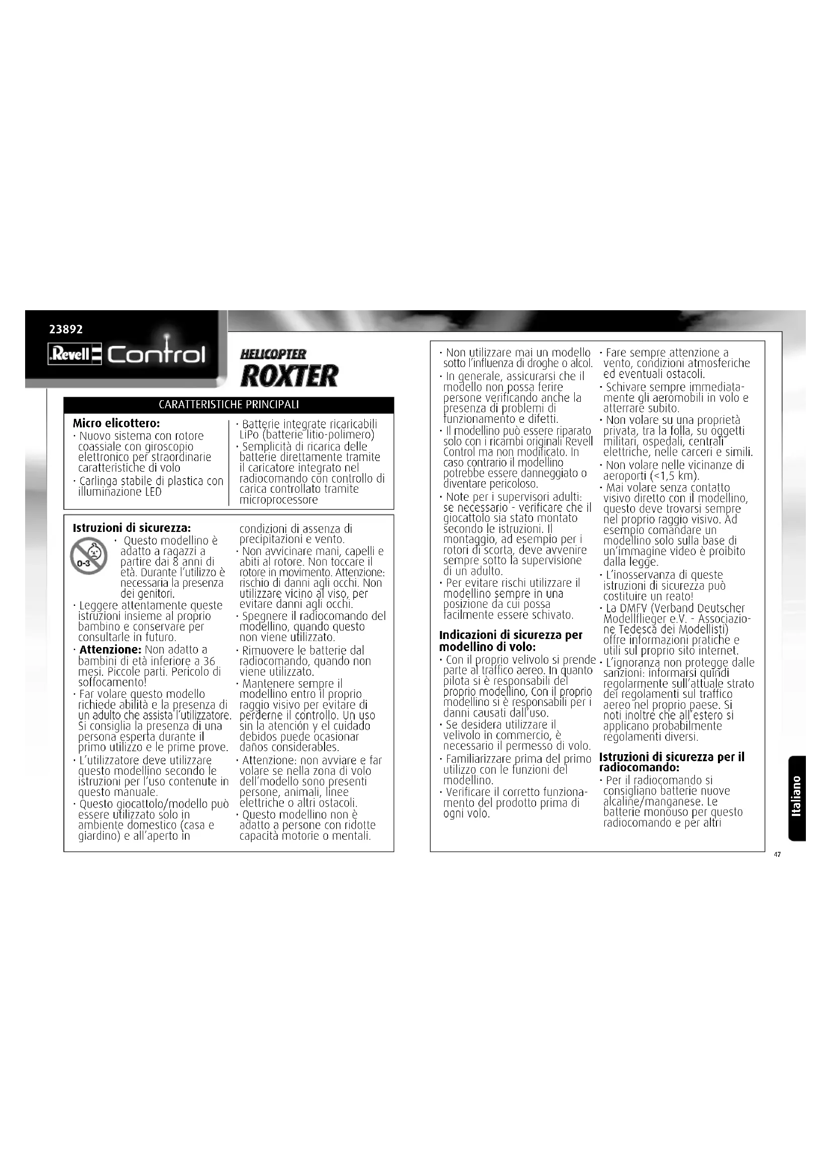 - Il modellino più essere riparato solo con i ricambi originali Revell Control ma non modificato. In caso contrario il modellino potrebbe essere danneggiato o diventare pericoloso.