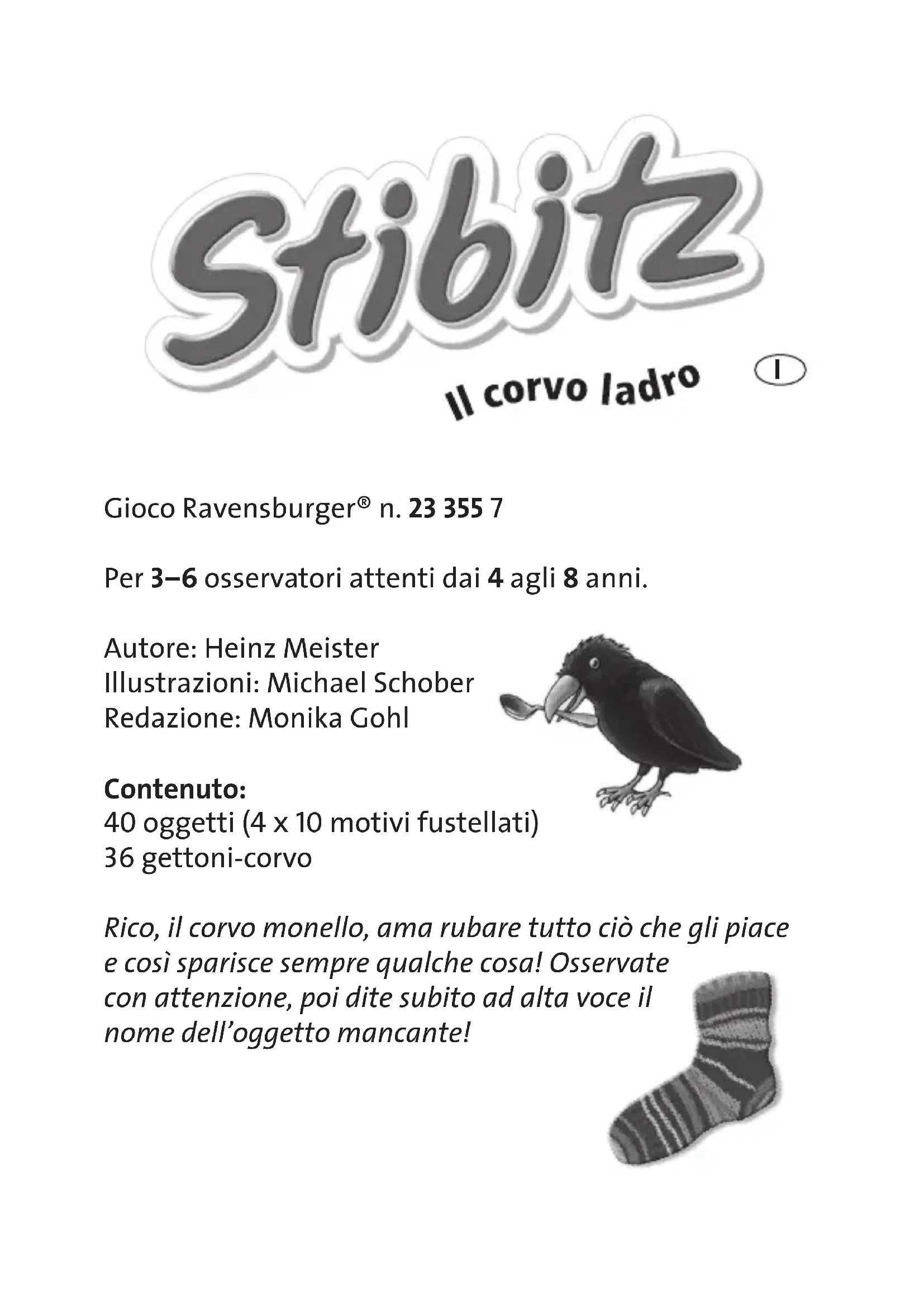 But du jeu Tous les objets sont éparpillés sur la table. À chaque tour, un nouveau joueur en retire un secrètement. Tous les autres joueurs en même temps doivent ensuite retrouver ce qui manque. Le premier qui retrouve l’objet peut se débarrasser d’un jeton Corbeau. Qui se défaussera le premier de tous ses jetons ? Préparation Avant la première partie, détacher soigneusement tous les objets et les jetons Corbeau prédécoupés de la planche. Étaler les objets sur la table en les mélangeant bien, sans qu’ils se superposent. Déroulement de la partie Avant de commencer, observer attentivement tous les objets : Où se trouve chacun d’eux ? Disparition Le plus jeune joueur peut faire disparaître l’objet du pre- mier tour. Tous les autres joueurs se retournent et fer- ment les yeux. Bien sûr, interdiction de tricher ! Pendant ce temps,-là, le voleur fait disparaître un objet de son choix de la table et le cache de manière à ce que les autres ne le voient pas. Il donne alors le signal en criant : « Crôa, crôa, Rico le corbeau est passé par là. »7 Recherche et défausse des jetons Corbeau Tous les autres joueurs cherchent en même temps. Qui trouvera le premier l’objet qui n’est plus présent qu’en 3 exemplaires ? Celui qui pense avoir deviné, crie très fort le nom de l’objet : par exemple, « Il manque la couronne ! ». Si c’est effectivement la couronne qui manque, le joueur peut remettre un de ses jetons Corbeau dans la boîte. Attention : Si le joueur se trompe d’objet, il récupère un jeton Corbeau supplémentaire de la boîte, mais il peut continuer à participer durant ce tour. Tour suivant Une fois l’objet manquant découvert, le tour est termi- né. Il est alors remis parmi les autres. Un nouveau tour commence et c’est au joueur suivant de faire disparaître un objet…8 Fin de la partie Lorsqu’un joueur n’a plus de jeton, il remporte la partie. Variante pour les plus jeunes Le jeu est plus simple si chaque objet n’est présent qu’en 3 exemplaires. Au début de la partie, laisser un exem- plaire de chaque objet de côté. Amusez-vous bien à faire disparaître les objets ! © 2013 Ravensburger SpieleverlagGioco Ravensburger® n. 23 355 7 Per 3–6 osservatori attenti dai 4 agli 8 anni. Autore: Heinz Meister Illustrazioni: Michael Schober Redazione: Monika Gohl Contenuto: 40 oggetti (4 x 10 motivi fustellati) 36 gettoni-corvo Rico, il corvo monello, ama rubare tutto ciò che gli piace e così sparisce sempre qualche cosa! Osservate con attenzione, poi dite subito ad alta voce il nome dell’oggetto mancante! I10 Scopo del gioco Tutti gli oggetti sono sparsi qua e là sul tavolo. Ad ogni turno, un giocatore sempre diverso deve prenderne uno di nascosto. Successivamente, tutti gli altri partecipanti dovranno guardare insieme e scoprire che cosa è stato rubato. Il giocatore che per primo dice ad alta voce il nome dell’oggetto mancante, può restituire un gettone- corvo. Chi resterà per primo senza gettoni? Preparazione Prima di iniziare a giocare per la prima volta, staccate dalla tavola prefustellata tutti gli oggetti e i gettoni-corvo. Mettete gli oggetti in ordine sparso sul tavolo in modo che siano tutti ben visibili, non sovrapposti tra di loro. A ciascun giocatore vengono consegnati quattro getto- ni-corvo. Riunite i restanti gettoni in un mazzo che con- serverete all’interno della scatola. Svolgimento del gioco Prima di iniziare, osservate con attenzione ogni singolo oggetto e cercate di memorizzarne la posizione. Il furto Nel primo giro, toccherà al giocatore più giovane rubare l’oggetto. Tutti gli altri partecipanti devono perciò voltar- si e chiudere bene gli occhi. E’ vietato barare!11 A questo punto, il ladruncolo prende dal tavolo un og- getto a scelta e lo nasconde in modo che nessuno possa vederlo, poi dà il via alla ricerca con il comando ”Al ladro! Rico il corvo è stato qui!“ La ricerca dell’oggetto e la restituzione dei gettoni-corvo Gli altri giocatori, tutti contemporaneamente, osservano con attenzione gli oggetti ancora sul tavolo: di quale og- getto sono rimaste soltanto 3 copie? Chi pensa di averlo scoperto, pronuncia il nome dell’oggetto a voce alta, per esempio: “Manca la corona!“ Se il giocatore ha indovinato perché l’oggetto rubato è proprio la corona, egli può restituire uno dei suoi gettoni- corvo mettendolo nella riserva, all’interno della scatola. Attenzione: se avete pronunciato il nome dell’oggetto sbagliato, dovrete invece prendere un gettone dalla ri- serva, così ne avrete uno in più. In ogni caso, potete con- tinuare a giocare. Il giro successivo Una volta riconosciuto l’oggetto giusto, il giro è termina- to. Rimettete l’oggetto rubato in mezzo agli altri. E’ il momento di iniziare un nuovo giro e tocca al gioca- tore successivo compiere il furto…Fine del gioco Vince chi termina per primo i propri gettoni-corvo. Variante per i giocatori più piccoli Il gioco è più semplice se ogni oggetto è ripetuto so- lamente tre volte. Mettete da parte la quarta copia di ognuno dei dieci diversi oggetti e... Buon divertimento! © 2013 Ravensburger Spieleverlag