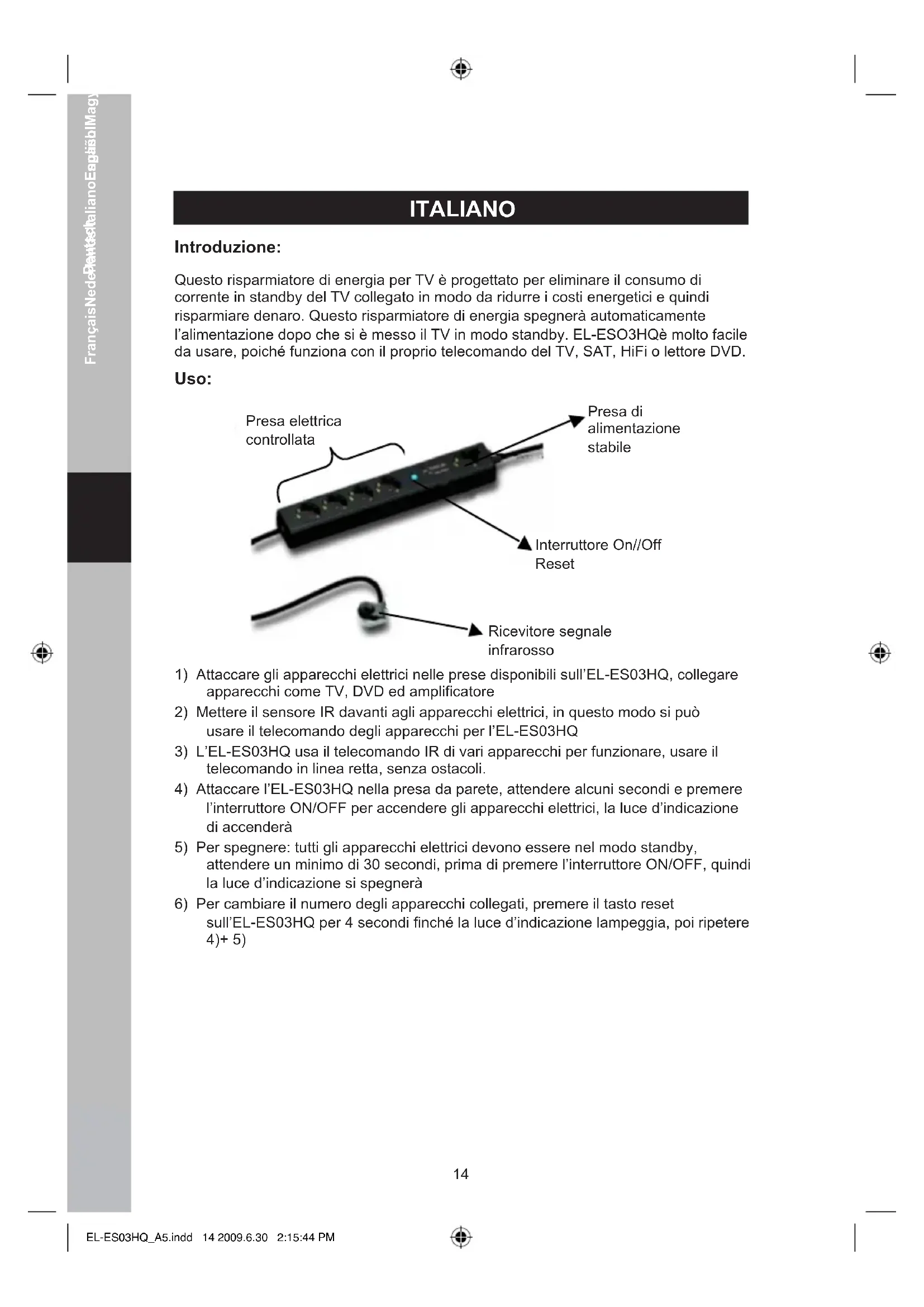 ATTENZIONE Quando si usa il risparmiatore di energia per TV, si devono sempre prendere delle precauzioni di sicurezza per ridurre il rischio di incendio, shock elettrico e lesione, come segue: comprensione di tutte le istruzioni prima di usare questo apparecchio. Per ridurre il rischio di shock elettrico, questo prodotto dovrebbe venire aperto SOLO da un tecnico autorizzato quando è necessario ripararlo. Scollegare il prodotto dall’alimentazione e altri apparecchi se dovesse esserci un problema. Non esporre il prodotto ad acqua o umidità. Questo apparecchio dovrebbe essere usato da un tipo di sorgente di alimentazione indicato nell’etichetta. Se non si è sicure del tipo di alimentazione nella propria casa, si prega di consultare il proprio rivenditore per maggiori informazioni. Non sovraccaricare la presa; ciò può essere un rischio d’incendio o di shock elettrico. Non inserire mai oggetti di alcun tipo dentro la custodia di rivestimento dell’apparecchio poiché potrebbe toccare dei punti di tensione pericolosi o fare cortocircuito che potrebbe causare incendio o shock elettrico. Manutenzione: Pulire solo con un panno asciutto. Non utilizzare solventi detergenti o abrasivi. Garanzia: Non sarà accettata alcuna garanzia o responsabilità in relazione a cambiamenti e modiche del prodotto o a danni determinati dall’uso non corretto del prodotto stesso. Generalità: Il design e le caratteristiche tecniche sono soggetti a modica senza necessità di preavviso. Tutti i marchi a logo e i nomi di prodotto sono marchi commerciali o registrati dei rispettivi titolari e sono riconosciuti come tali in questo documento. Tenere questo manuale come riferimento futuro. Attenzione: Il prodotto è contrassegnato con questo simbolo, con il quale si indica che i prodotti elettrici ed elettronici non devono essere gettati insieme ai riuti domestici. Per questi prodotti esiste un sistema di raccolta differenziata. Copyright © EL-ES03HQ_A5.indd 16 2009.6.30 2:15:45 PMEnglish Deutsch Français Nederlands Italiano Español Magyar Suomi Svenska Česky Română Ελληνικά