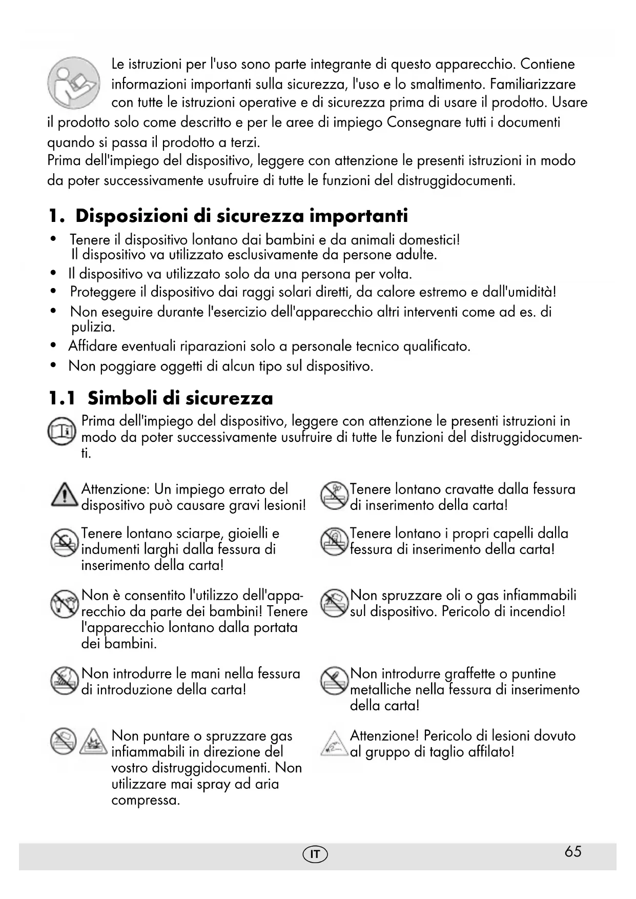 Le istruzioni per l'uso sono parte integrante di questo apparecchio. Contiene informazioni importanti sulla sicurezza, l'uso e lo smaltimento. Familiarizzare con tutte le istruzioni operative e di sicurezza prima di usare il prodotto. Usare il prodotto solo come descritto e per le aree di impiego Consegnare tutti i documenti quando si passa il prodotto a terzi. Prima dell'impiego del dispositivo, leggere con attenzione le presenti istruzioni in modo da poter successivamente usufruire di tutte le funzioni del distruggidocumenti.