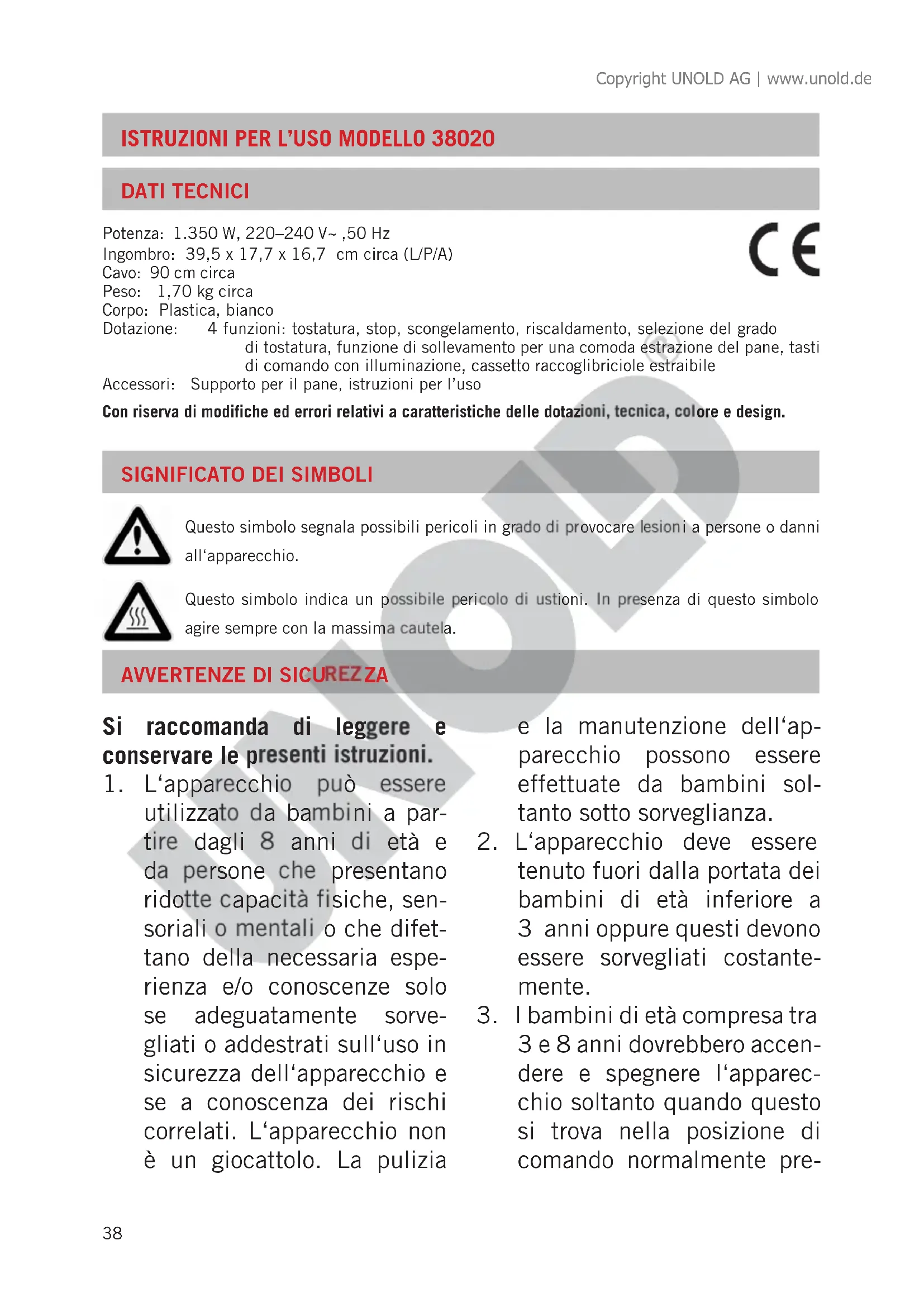 neggiato, deve essere fornito dal fabbricante o dal suo ser- vizio o di una persona qua- lificata, in modo simile ad essere sostituito, al fine di evitare rischi. Copyright UNOLD AG | www.unold.de41 ATTENZIONE: Durante il funzionamento l‘apparecchio diventa molto caldo! Non aprire mai la scocca dell‘apparecchio. Non tenere oggetti, posate o parti del corpo nelle fessure di pane. Pericolo di scossa elettrica. Il produttore non si assume alcuna responsabilità per un montaggio scorretto, un utilizzo inappropriato o errato oppure in seguito a riparazioni effettuate da officine o persone non autorizzate.