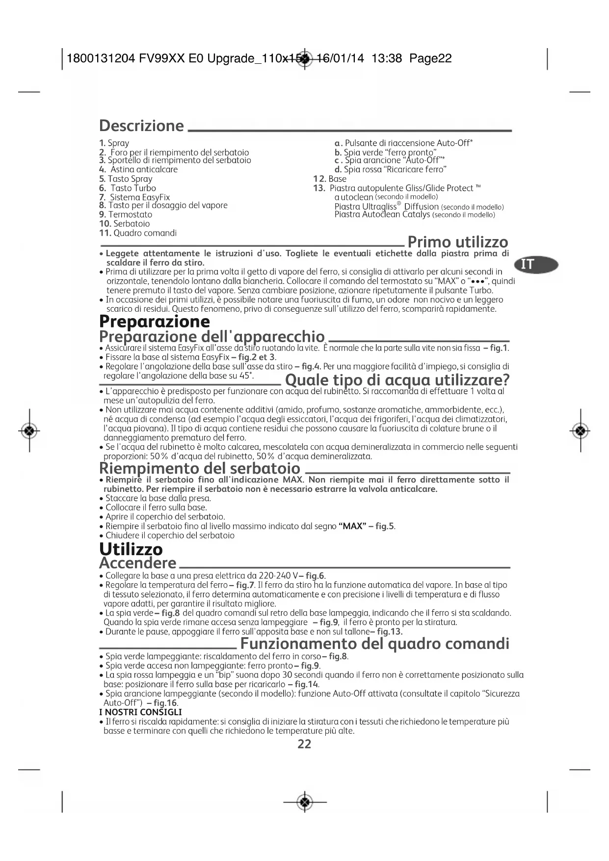- Sollevare il ferro e la base con entrambe le mani – fig.26 e 27. Partecipiamo alla protezione dell’ambiente! i I l vostro apparecchio è composto da diversi materiali che possono essere riciclati. ‹ L asciatelo in un punto di raccolta o presso un Centro Assistenza Autorizzato. 1800131204FV99XXE0Upgrade_110x15416/01/1413:38Page2425