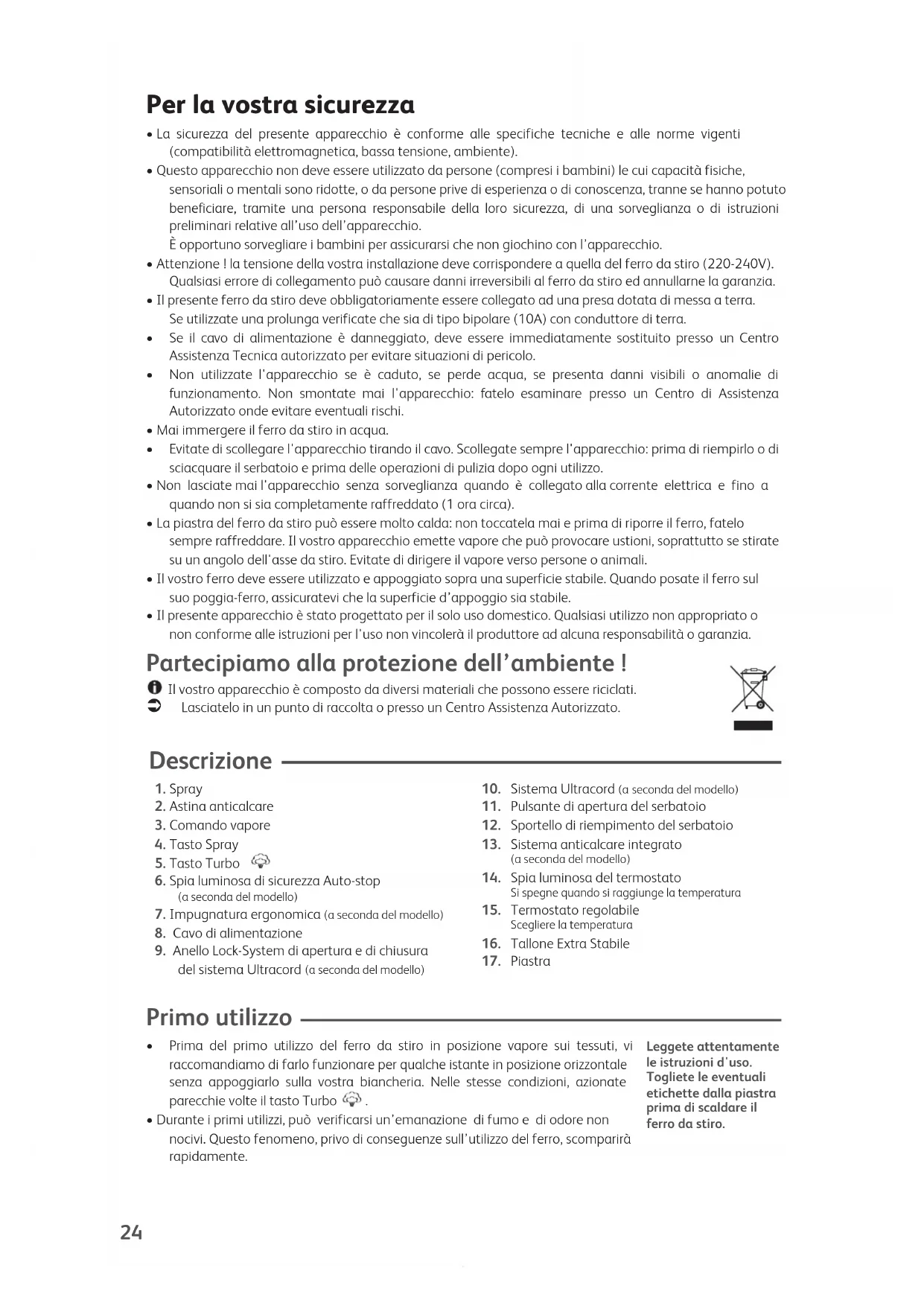 - Il presente apparecchio è stato progettato per il solo uso domestico. Qualsiasi utilizzo non appropriato o non conforme alle istruzioni per l'uso non vincolerà il produttore ad alcuna responsabilità o garanzia. Partecipiamo alla protezione dell’ambiente ! Il vostro apparecchio è composto da diversi materiali che possono essere riciclati. Ü Lasciatelo in un punto di raccolta o presso un Centro Assistenza Autorizzato. Descrizione