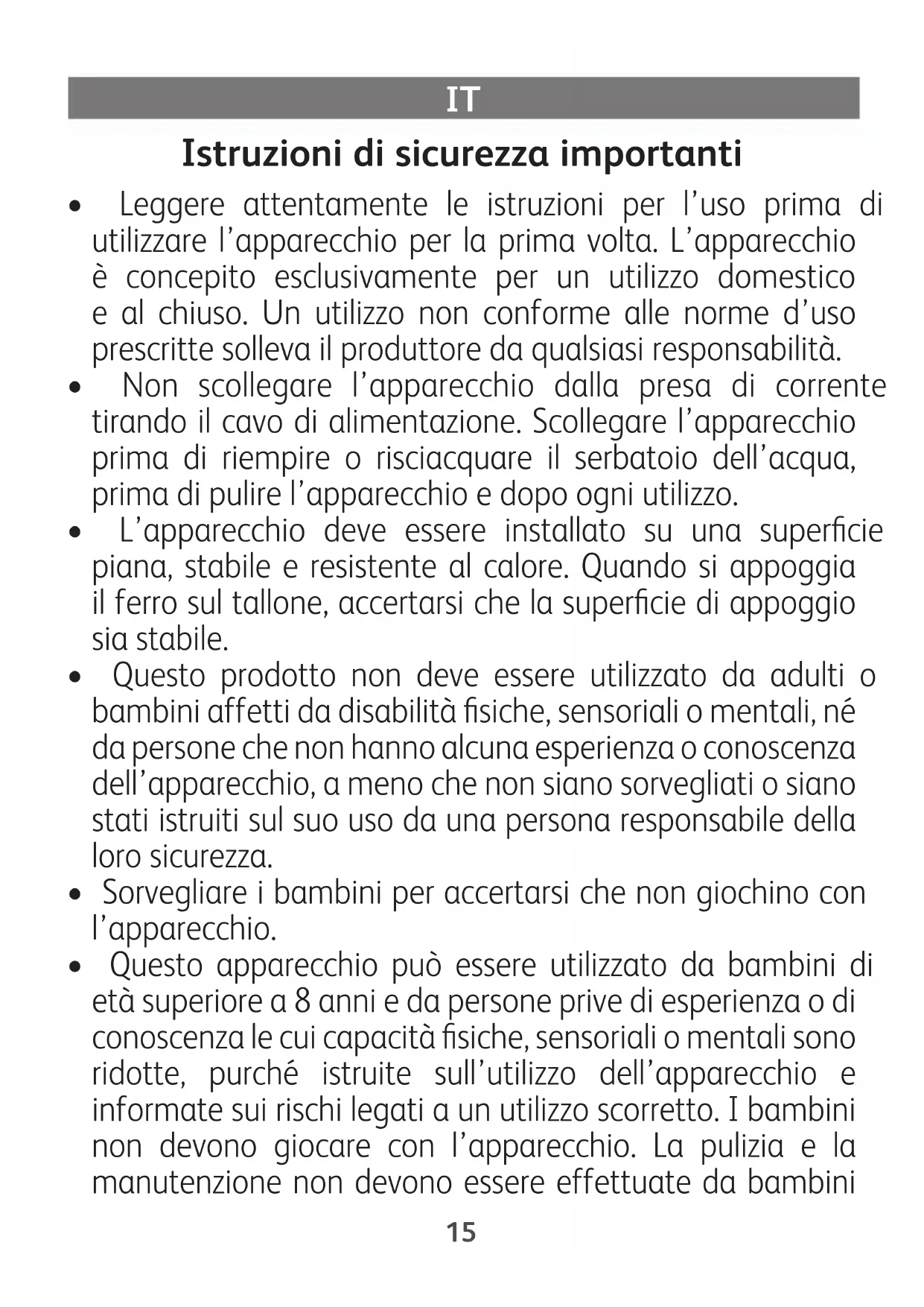 - Questo apparecchio può essere utilizzato da bambini di età superiore a 8 anni e da persone prive di esperienza o di conoscenza le cui capacità fisiche, sensoriali o mentali sono ridotte, purché istruite sull’utilizzo dell’apparecchio e informate sui rischi legati a un utilizzo scorretto. I bambini non devono giocare con l’apparecchio. La pulizia e la manutenzione non devono essere effettuate da bambinisenza la supervisione di un adulto.Quando il ferro è acceso o in fase di raffreddamento, tenere il ferro e il cavo fuori dalla portata dei bambini di età inferiore a 8 anni.