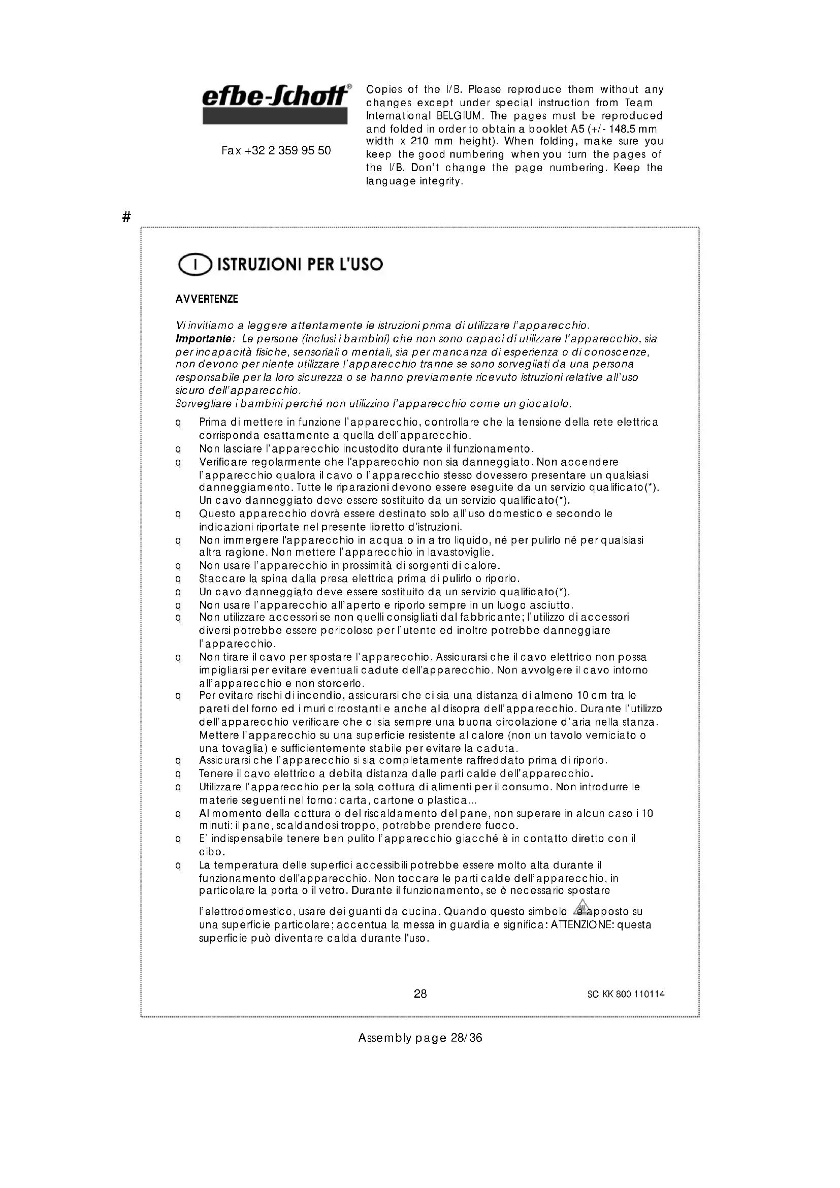 SC KK 800 110114 Assembly page 31/36 Fax +32 2 359 95 50 Non immergere mai l’apparecchio in acqua o in altri liquidi DIRETTIVA 2002/96/CE PER LO SMALTIMENTO DELLE APPARECCHIATURE ELETTRICHE ED ELETTRONICHE Per preservare l'ambiente e la nostra salute, l'eliminazione dei vecchi apparecchi elettrici ed elettronici non più utilizzati, va fatta secondo la direttiva sopra citata che impone l'obbligo al costruttore, al commerciante ed all'utilizzatore di consegnare gli apparecchi ai centri di raccolta specializzati, i quali saranno in grado di smaltire e riciclare i vecchi prodotti come la legge prescrive. Per questa ragione troverete apposto sull’etichetta segnaletica il simbolo che indica di non gettare il vecchio apparecchio non più utilizzato, in pattumiera o nel cassonetto delle immondizie. Potrete smaltire il vecchio apparecchio consegnandolo direttamente al rivenditore dove andrete ad acquistarne uno nuovo, o direttamente nei centri di raccolta specializzati messi a disposizione dal vostro comune di residenza.# Copies of the I/B. Please reproduce them without any changes except under special instruction from Team International BELGIUM. The pages must be reproduced and folded in order to obtain a booklet A5 (+/- 148.5 mm width x 210 mm height). When folding, make sure you keep the good numbering when you turn the pages of the I/B. Don’t change the page numbering. Keep the language integrity.