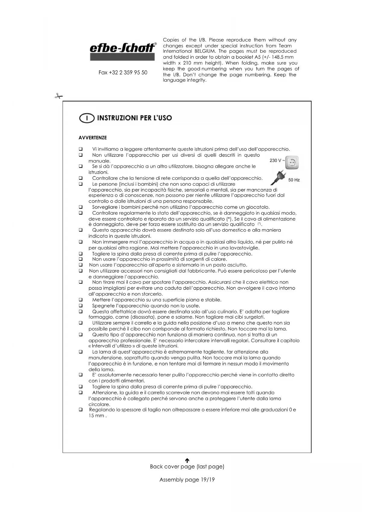 Fax +32 2 359 95 50 Attenzione, il carrello scorrevole (7) che permette di guidare gli alimenti, è in “kit” (3 parti). Per ragioni di sicurezza è assolutamente necessario assicurarsi prima di ogni uso che è stato montato correttamente e che non manca alcuna parte. Riferirsi ai disegni di montaggio nelle pagine 2 e 4. (*) Servizio qualificato : Servizio Assistenza del fabbricante o dell’importatore o una persona qualificata, riconosciuta ed autorizzata ad effettuare riparazioni, per evitare ogni pericolo, respingere in ogni caso l’apparecchio a questo servizio.