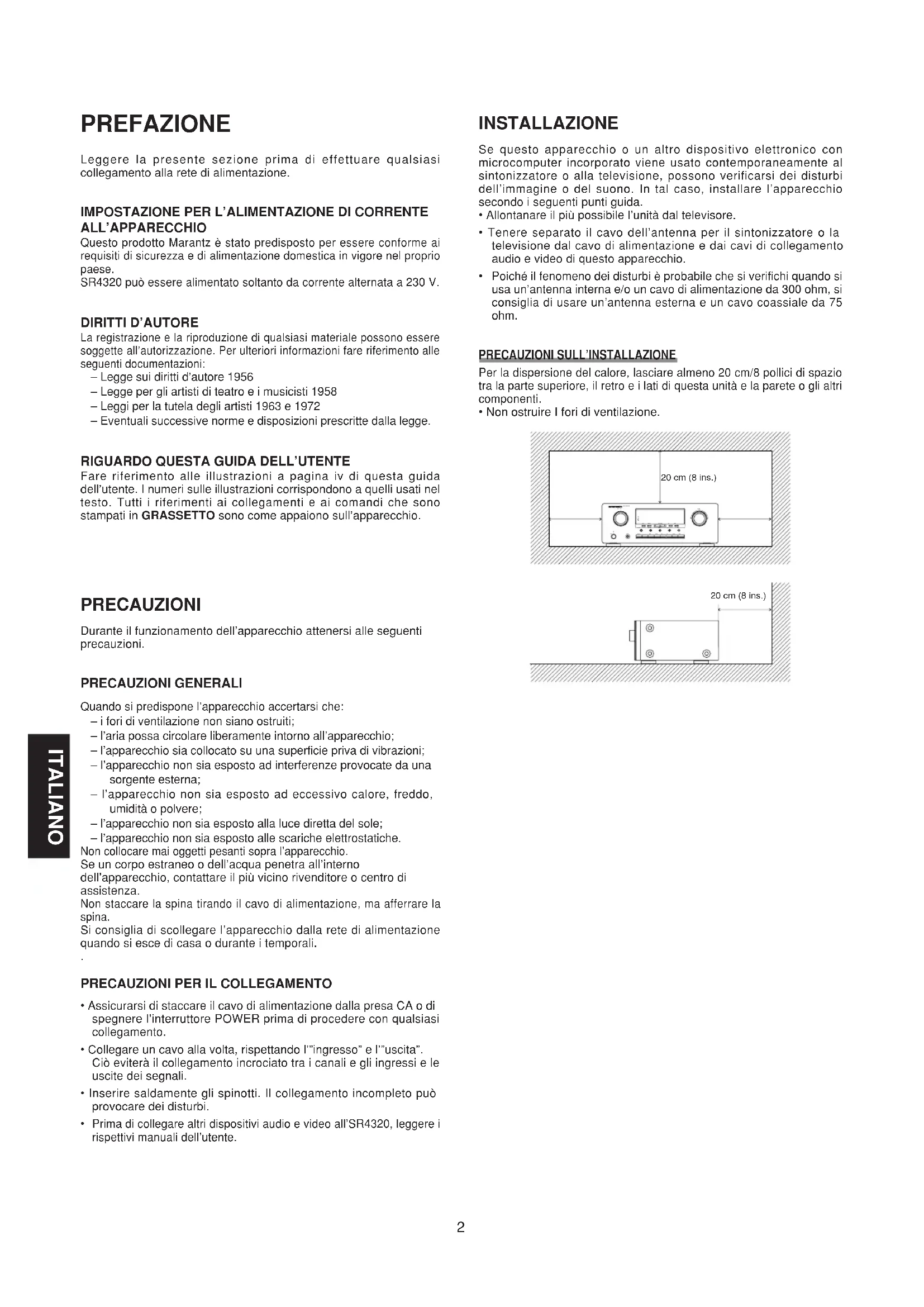 ALL’APPARECCHIO Questo prodotto Marantz è stato predisposto per essere conforme airequisiti di sicurezza e di alimentazione domestica in vigore nel propriopaese.SR4320 può essere alimentato soltanto da corrente alternata a 230 V.
