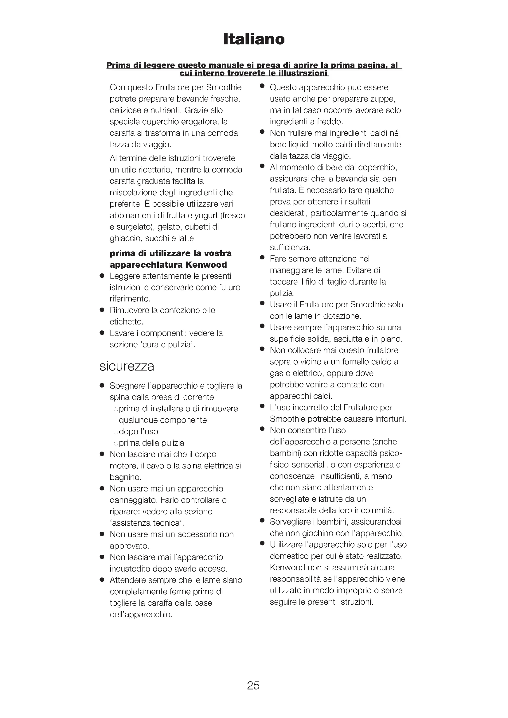 Utilizzare l'apparecchio solo per l'uso domestico per cui è stato realizzato. Kenwood non si assumerà alcuna responsabilità se l'apparecchio viene utilizzato in modo improprio o senza seguire le presenti istruzioni.
