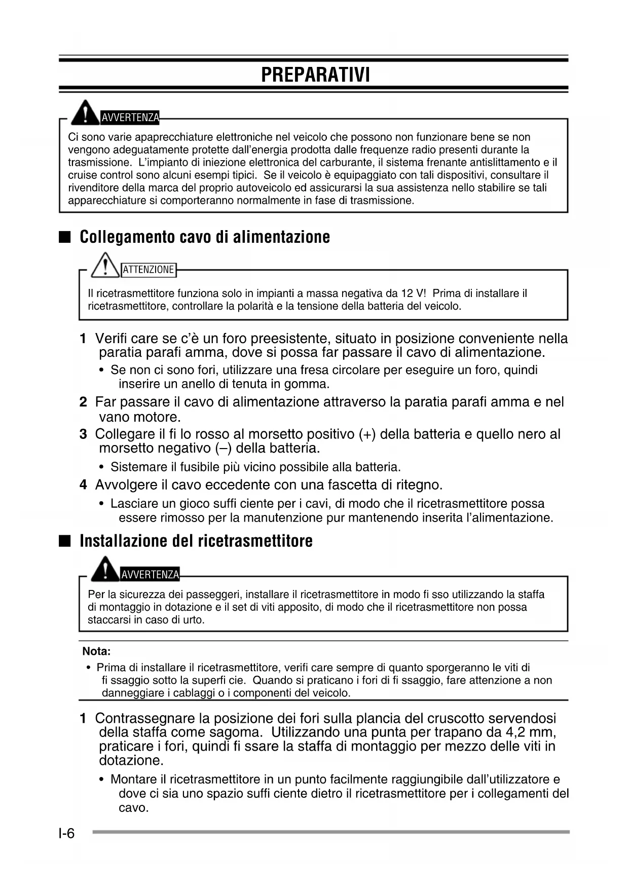 - Microfono gancio (con vite autofi lettante 4 x 16 mm) . . . . . . . . . . . . . . . . . . . . . . . . . . . . . . . . . 1 Guida per l'utente . . . . . . . . . . . . . . . . . . . . . . . . . . . . . . . . . . . . . . . . . . . . . . . . . . . . . 1I-6 PREPARATIVI AVVERTENZA Ci sono varie apaprecchiature elettroniche nel veicolo che possono non funzionare bene se non vengono adeguatamente protette dall’energia prodotta dalle frequenze radio presenti durante la trasmissione. L’impianto di iniezione elettronica del carburante, il sistema frenante antislittamento e il cruise control sono alcuni esempi tipici. Se il veicolo è equipaggiato con tali dispositivi, consultare il rivenditore della marca del proprio autoveicolo ed assicurarsi la sua assistenza nello stabilire se tali apparecchiature si comporteranno normalmente in fase di trasmissione. ■ Collegamento cavo di alimentazione ATTENZIONE Il ricetrasmettitore funziona solo in impianti a massa negativa da 12 V! Prima di installare il ricetrasmettitore, controllare la polarità e la tensione della batteria del veicolo. 1 Verifi care se c’è un foro preesistente, situato in posizione conveniente nella paratia parafi amma, dove si possa far passare il cavo di alimentazione.