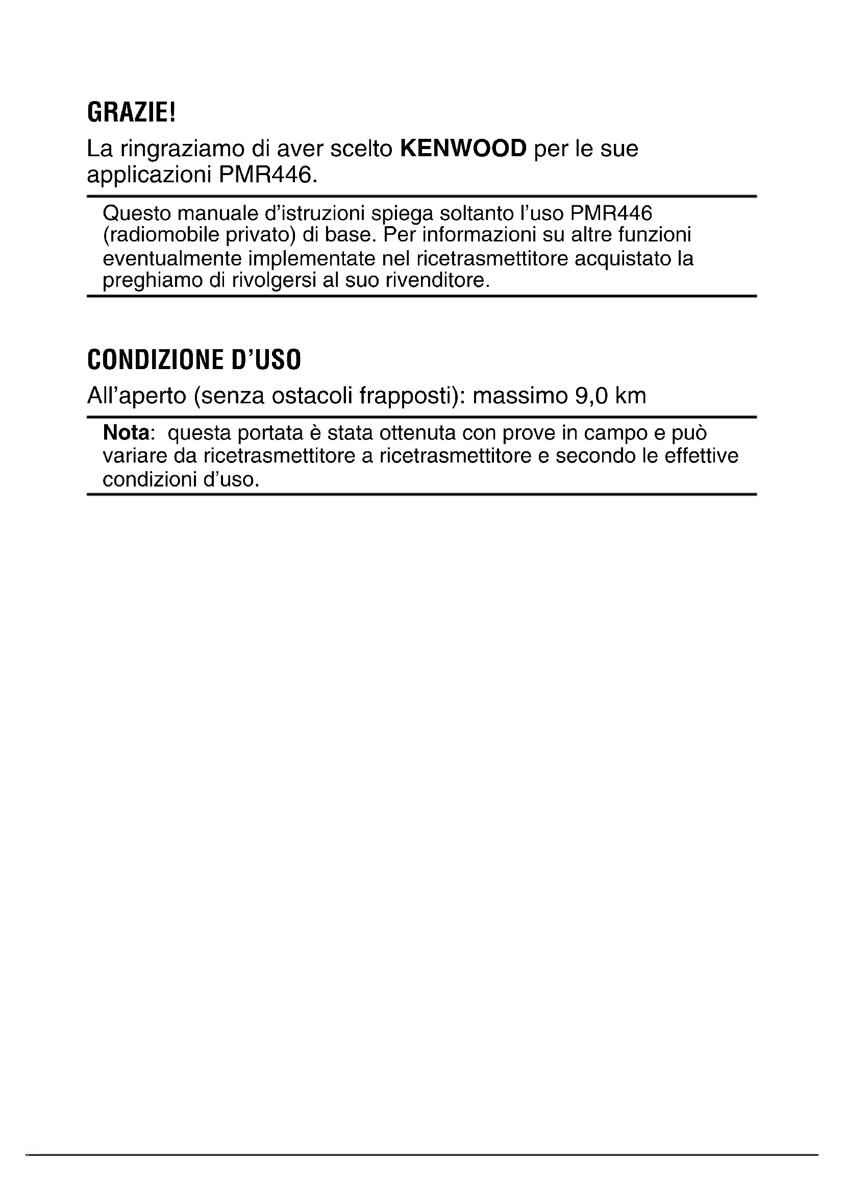 - Mientras está activada la función Súperbloqueo-P, podrá realizar las siguientes acciones: PTT, Desactivar silenciamiento, Monitor, Potencia, Volumen.RICETRASMETTITORE FM UHF PKT-23 MANUALE DI INSTRUZIONIGRAZIE! La ringraziamo di aver scelto KENWOOD per le sue applicazioni PMR446. Questo manuale d’istruzioni spiega soltanto l’uso PMR446 (radiomobile privato) di base. Per informazioni su altre funzioni eventualmente implementate nel ricetrasmettitore acquistato la preghiamo di rivolgersi al suo rivenditore.