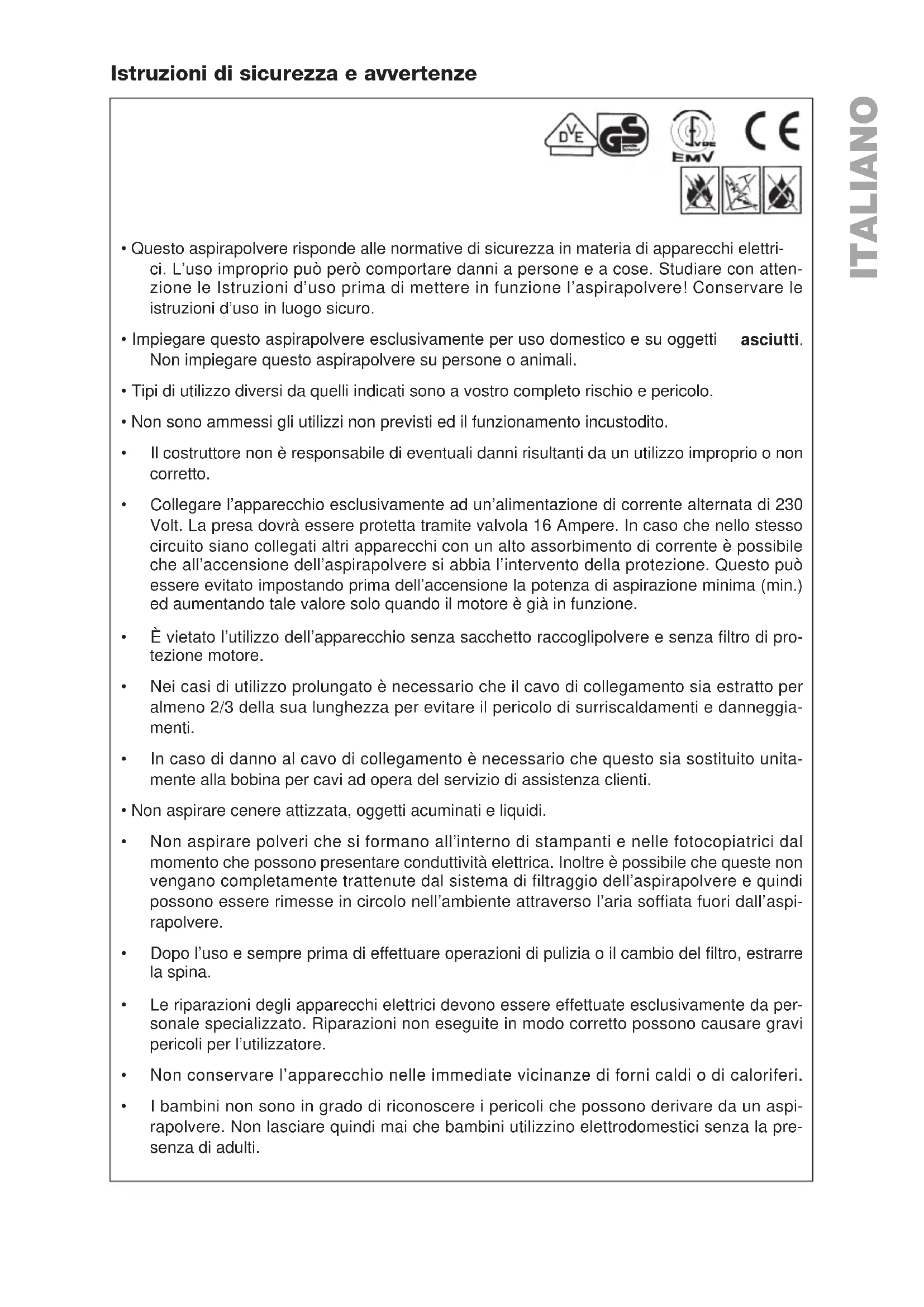 - Collegare l’apparecchio esclusivamente ad un’alimentazione di corrente alternata di 230 Volt. La presa dovrà essere protetta tramite valvola 16 Ampere. In caso che nello stesso circuito siano collegati altri apparecchi con un alto assorbimento di corrente è possibile che all’accensione dell’aspirapolvere si abbia l’intervento della protezione. Questo può essere evitato impostando prima dell’accensione la potenza di aspirazione minima (min.) ed aumentando tale valore solo quando il motore è già in funzione.