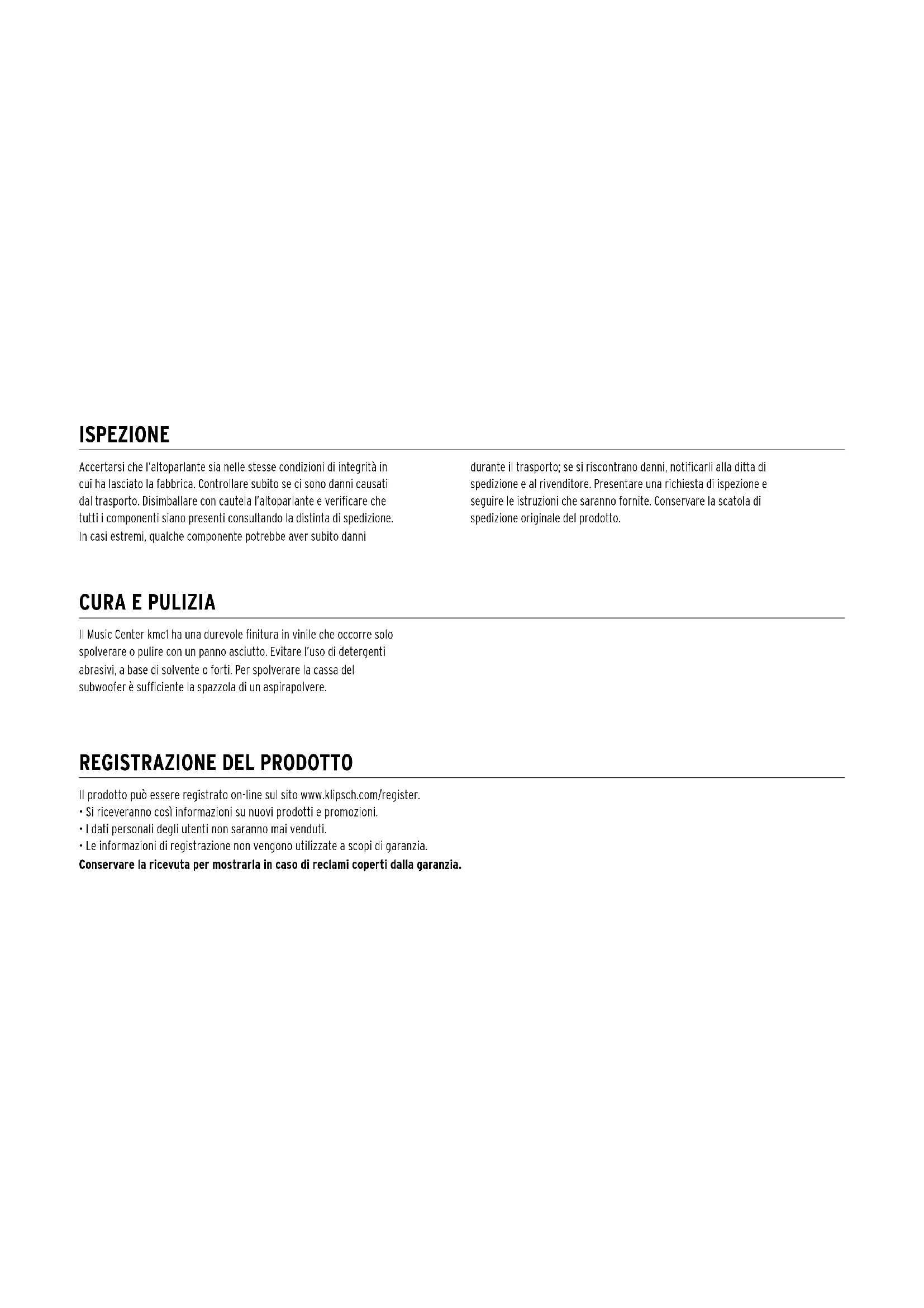 Il prodotto può essere registrato on-line sul sito www.klipsch.com/register.