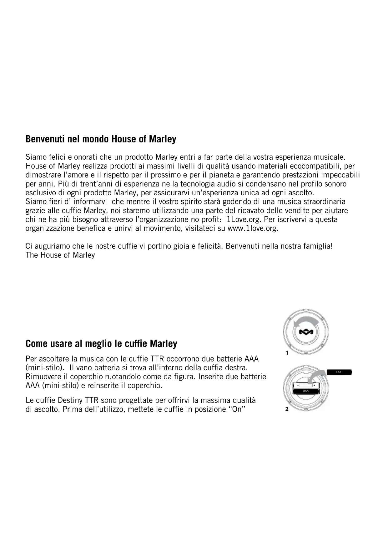 2ruotando la manopola all’esterno della cuffia sinistra. Si accenderà una spia che indica che le cuffie sono accese e pronte all’uso. La tecnologia delle cuffie TTR elimina attivamente il rumore esterno indesiderato per rendervi la potenza e la fedeltà sonora che la vostra musica merita. Le cuffie Destiny Trenchtown Work hanno due cavi. Un cavo serve per ascoltare la musica durante gli spostamenti o per effettuare le chiamate con il telefono cellulare. Il secondo cavo è molto più lungo e serve per l’ascolto stazionario, nel caso ci si trovi più lontani dall’impianto audio. Ciascun cavo ha un connettore da 3,5 mm all’estremità che deve essere collegato alla presa di ingresso sotto la cuffia sinistra. Compatibilità del microfono e comandi a pulsante singolo Il microfono integrato permette le conversazioni in vivavoce. Premete il pulsante per rispondere alla chiamata e premetelo di nuovo per terminare la chiamata. Ascolto responsabile Accertatevi di abbassare il volume del lettore musicale prima di iniziare l’ascolto. In questo modo non rischierete danni all’udito dovuti al volume eccessivo. Non indossate mai le cuffie durante l’uso di macchinari, alla guida di un’auto o comunque, quando siete impegnati in un’attività in cui l’ascolto dei rumori esterni è importante. Se avvertite dolore o fastidio durante o dopo l’ascolto in cuffia, è possibile che abbiate impostato un volume troppo alto.Un volume eccessivo può provocare danni permanenti all’udito. “O” Position “On” Position via suLinee guida emesse dall’Occupational Safety and Health Administration (OSHA) in materia di livelli di rumore consentiti e durata di esposizione. Livello di pressione Sonora [Sound Pressure Level (SPL)] Esposizione giornaliera massima raccomandata 90dB 8 ore 92dB 6 ore 95dB 4 ore 100dB 2 ore 105dB 1 ora 110dB 30 minuti 115dB 15 minuti Valori superiori a 115 dB Evitare livelli SPL a partire da 115 dB Questo simbolo indica che il prodotto non deve essere smaltito assieme agli altri rifiuti domestici in tutti i Paesi dell’Unione Europea. Al fine di evitare un eventuale danno ambientale e alla salute umana derivante dallo smaltimento dei rifiuti non controllato, riciclare il prodotto in maniera responsabile per promuovere il riutilizzo sostenibile delle risorse materiali. Per la restituzione del dispositivo usato, utilizzare gli appositi sistemi di restituzione e raccolta oppure contattare il rivenditore presso cui il prodotto è stato acquistato, che provvederanno al suo riciclaggio in conformità alle norme di sicurezza ambientale. Spiega zione diretti va RAEEDue anni di garanzia limitata The House of Marley garantisce il presente prodotto contro difetti di materiale e lavorazione per un periodo di 2 anni dalla data di acquisto, salvo i casi indicati di seguito. La presente garanzia non copre eventuali danni causati dall’utilizzo improprio del prodotto, da eventi accidentali, dall’uso di accessori non omologati, da alterazioni apportate al prodotto o da altre condizioni al di fuori del controllo di The House of Marley. La presente garanzia è valida solo se il prodotto è stato acquistato e utilizzato nell’UE. La presente garanzia non copre i prodotti che richiedono modifiche o adattamenti per consentirne l’uso in Paesi diversi da quello per il quale sono stati progettati, prodotti, approvati e/o autorizzati, né i prodotti sottoposti a riparazioni per danni prodotti da dette modifiche. The House of Marley declina qualunque responsabilità per danni incidentali, consequenziali o speciali. Per ottenere l’assistenza in garanzia, recarsi presso il Punto di Vendita di acquisto del prodotto muniti dello scontrino recante la data (come prova d’acquisto). Dietro ricevuta, il punto vendita provvederà a riparare o sostituire il prodotto. Nel caso in cui si è impossibilitati a recarsi al Punto Vendita, contattare il Servizio Clienti The House of Marley al seguente numero + 39 02 91483342 o all’indirizzo e-mail: CS@thehouseofmarley.it. The House Of Marley presso HoMedics Italy Srl Via Carducci, 125 20099, Sesto San Giovanni (MI) Italy La presente Garanzia non è valida qualora la manutenzione del prodotto non venga affidata ad un punto assistenza The House of Marley autorizzato. La presente garanzia non inficia i diritti dei consumatori stabiliti dalla legge. Per ulteriori informazioni sulla linea di prodotti The House of Marley, visitate il sito www. thehouseofmarley.com. Diritti riservati.Velkommen til House of Marley Det glæder os og gør os stolte, at du har valgt dette Marley-produkt som en del af din musikoplevelse. Hos The House of Marley arbejder vi for at levere produkter, der er de bedste inden for deres klasse og fungerer fejlfrit i mange år fremover. Vi bruger miljøvenlige materialer i et fortsat arbejde for at vise vores medmennesker og vores planet kærlighed og respekt. Der indgår over 30 års lydteknisk erfaring i hvert Marley-produkts unikke lydmæssige karakter, så du hver gang får en fantastisk lytteoplevelse. Du skal vide, at mens du nyder den fantastiske gave, musikken er, bruger vi en del af overskuddet til at støtte mennesker i nød via 1Love.org. Besøg os på www.1love.org, hvis du ønsker at blive medlem af denne velgørenhedsorganisation og blive en del af bevægelsen. Vi håber, at du får rigtig meget glæde af dine høretelefoner og ønsker dig velkommen i vores familie. Kærlige hilsner The House of Marley Nyd dine Marley-høretelefoner To AAA-batterier er nødvendige, når du vil bruge TTR-høretelefoner. Batterierne er placeret inde i højre høretelefon. Fjern lågen ved at rotere den som vist her. Isæt to AAA-batterier og sæt lågen på igen. Dine Destiny TTR-høretelefoner er blevet udviklet til at give en lytteoplevelse af højeste kvalitet. Før du starter, skal du tænde for høretelefonerne ved at dreje skiven på ydersiden af venstre høretelefon AAA AAA